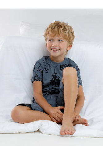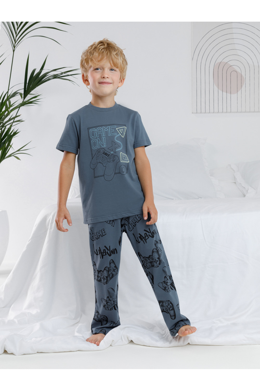 Пижама для мальчика из натурального хлопка. Футболка с короткими втачными рукавами и прямые брюки с эластичной резинкой в поясе. Оригинальная набивка и принт выполнены из стойких текстильных гипоаллергенных красителей. Изделие сохраняет цвет и форму после многократных стирок. Все трикотажные полотна производятся в соответствии с нормами швейцарского сертификата ЭкоТекс.