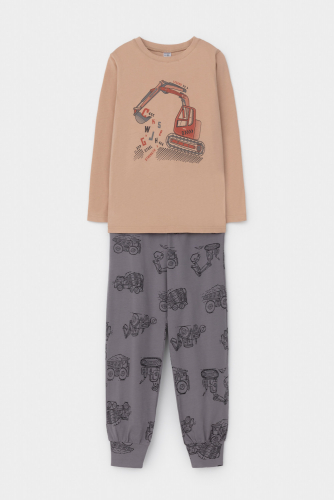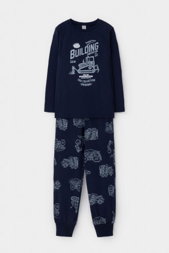 Пижама для мальчика из натурального хлопка. Джемпер с длинными втачными рукавами и брюки с эластичной резинкой в поясе. Мягкие манжеты по низу брюк сделаны из материала в рубчик. Оригинальная набивка и принт выполнены из стойких текстильных гипоаллергенных красителей. Изделие сохраняет цвет и форму после многократных стирок. Все трикотажные полотна производятся в соответствии с нормами швейцарского сертификата ЭкоТекс.