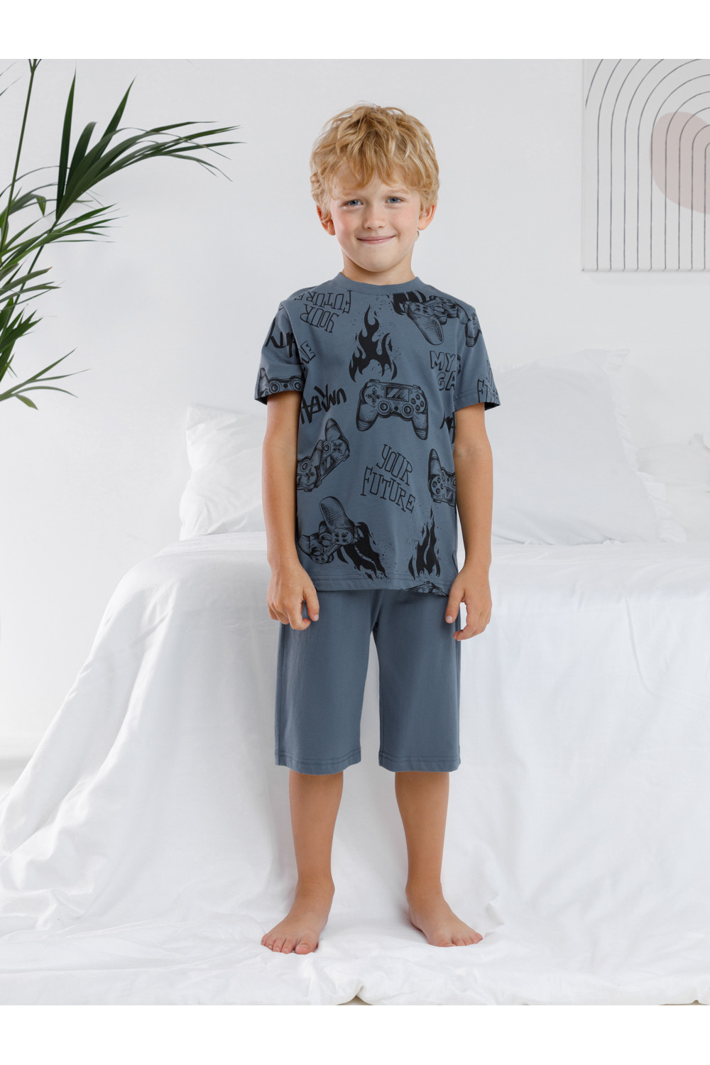 Пижама для мальчика из натурального хлопка. Футболка с короткими втачными рукавами и шорты с эластичной резинкой в поясе. Оригинальная набивка выполнена из стойких текстильных гипоаллергенных красителей. Изделие сохраняет цвет и форму после многократных стирок. Все трикотажные полотна производятся в соответствии с нормами швейцарского сертификата ЭкоТекс.