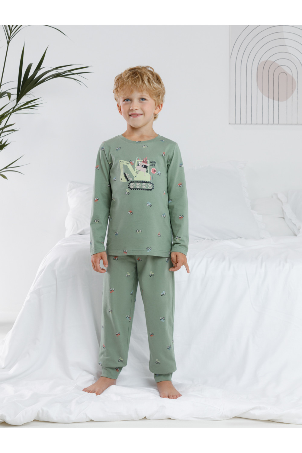 Пижама для мальчика из натурального хлопка. Джемпер с длинными втачными рукавами и брюки с эластичной резинкой в поясе. Мягкие манжеты по низу брюк сделаны из материала в рубчик. Оригинальная набивка и принт выполнены из стойких текстильных гипоаллергенных красителей. Изделие сохраняет цвет и форму после многократных стирок. Все трикотажные полотна производятся в соответствии с нормами швейцарского сертификата ЭкоТекс.