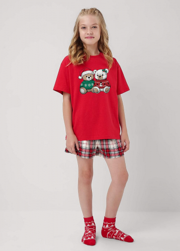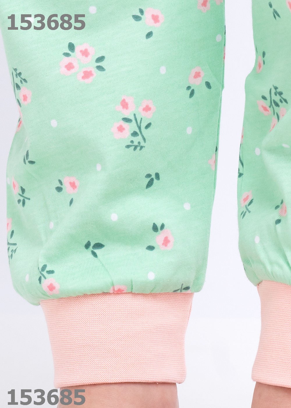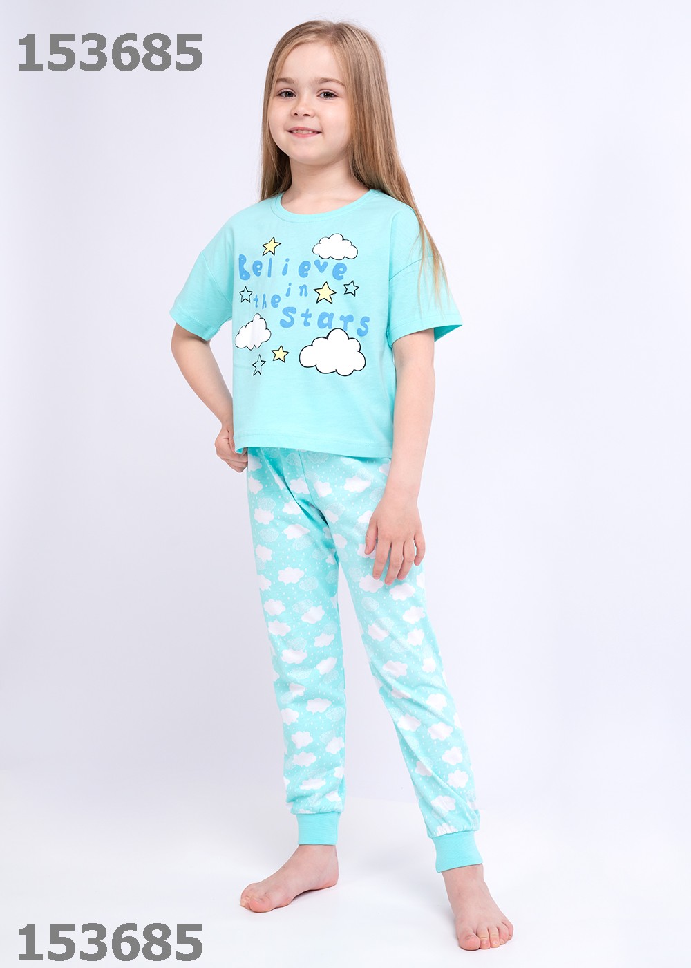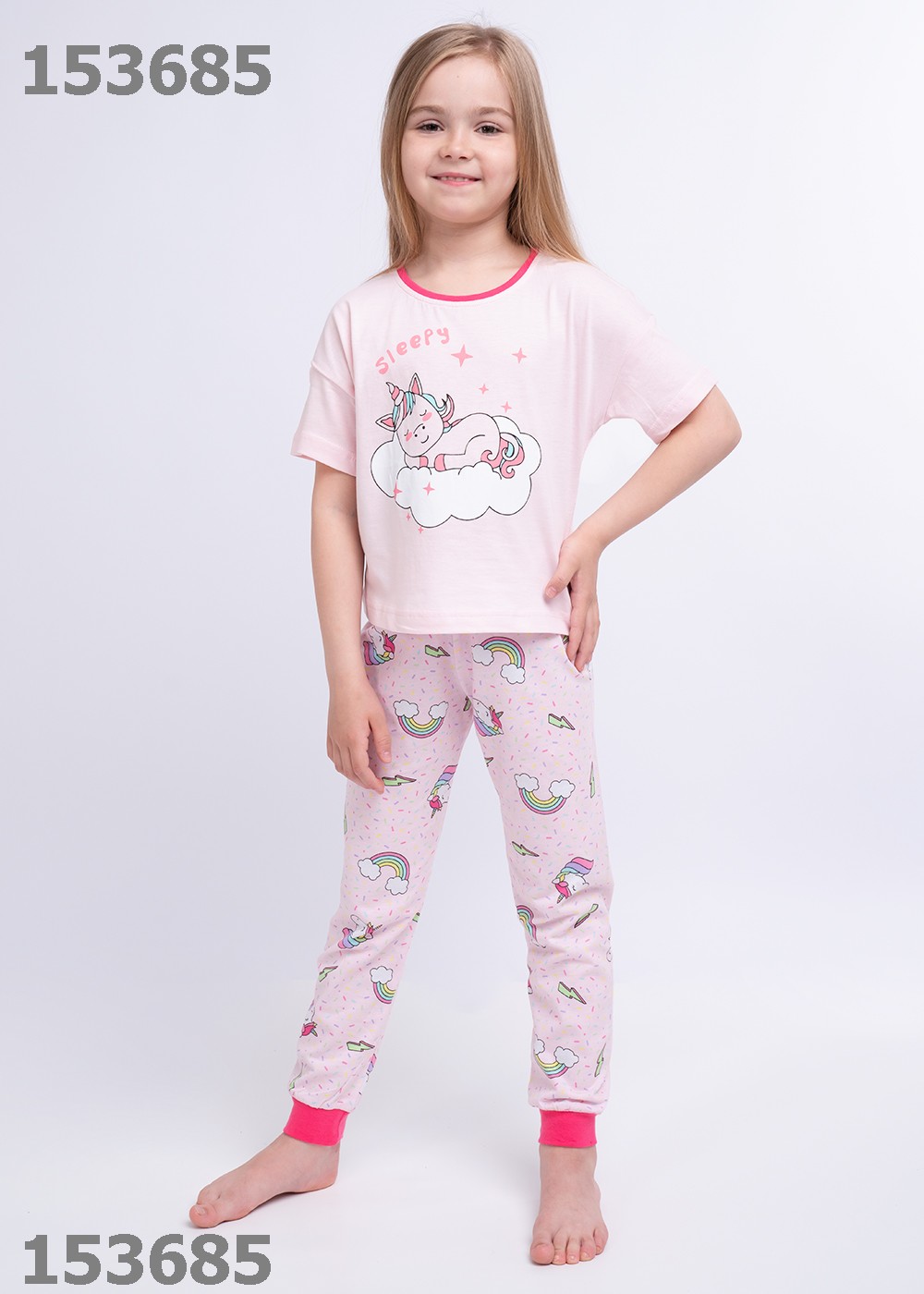 "Описание: Очаровательная хлопковая пижама. Обтачка горловины и манжеты брюк из эластичного полотна. Пояс брюк с резинкой. Модель украшена оригинальным ярким принтом.