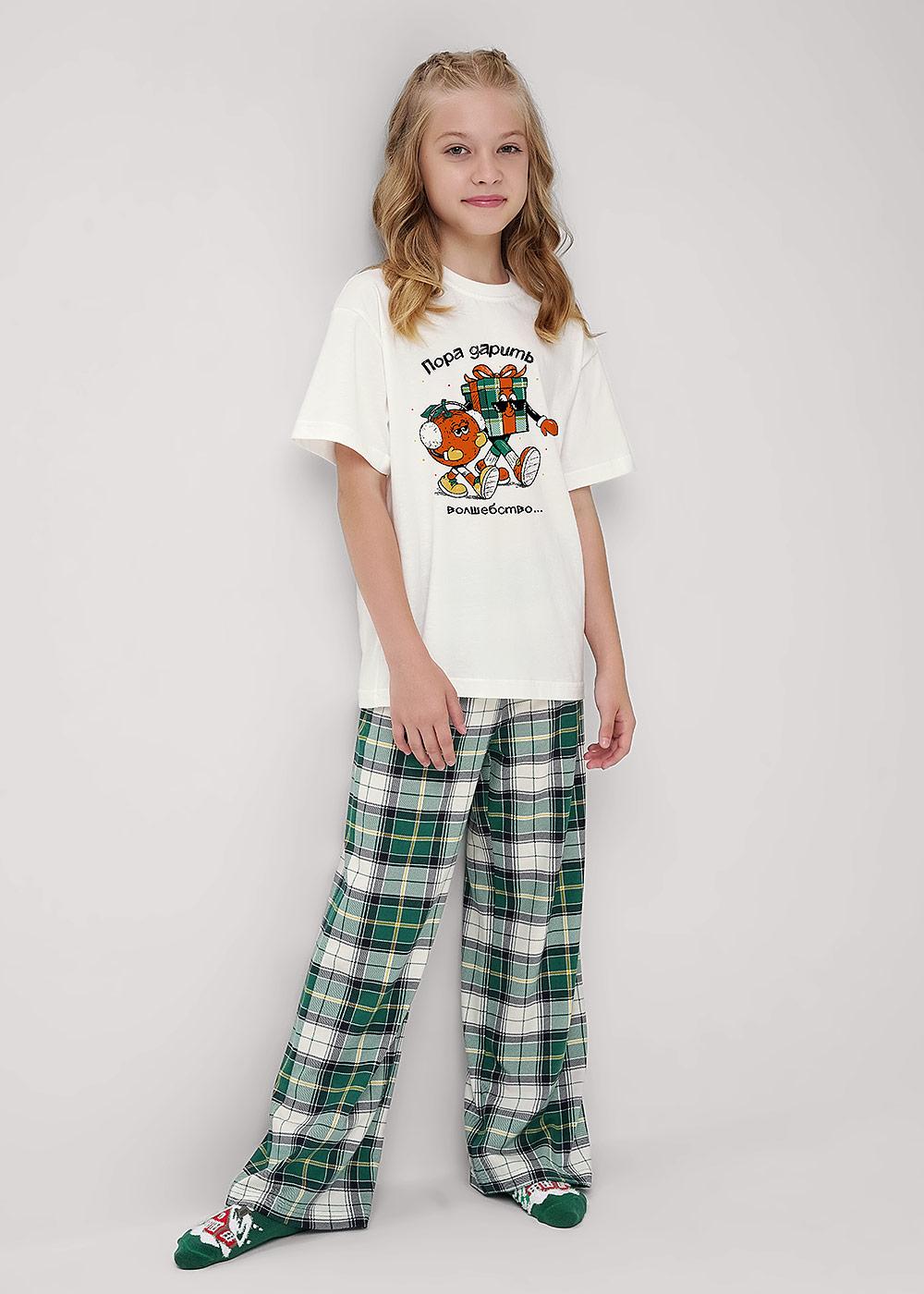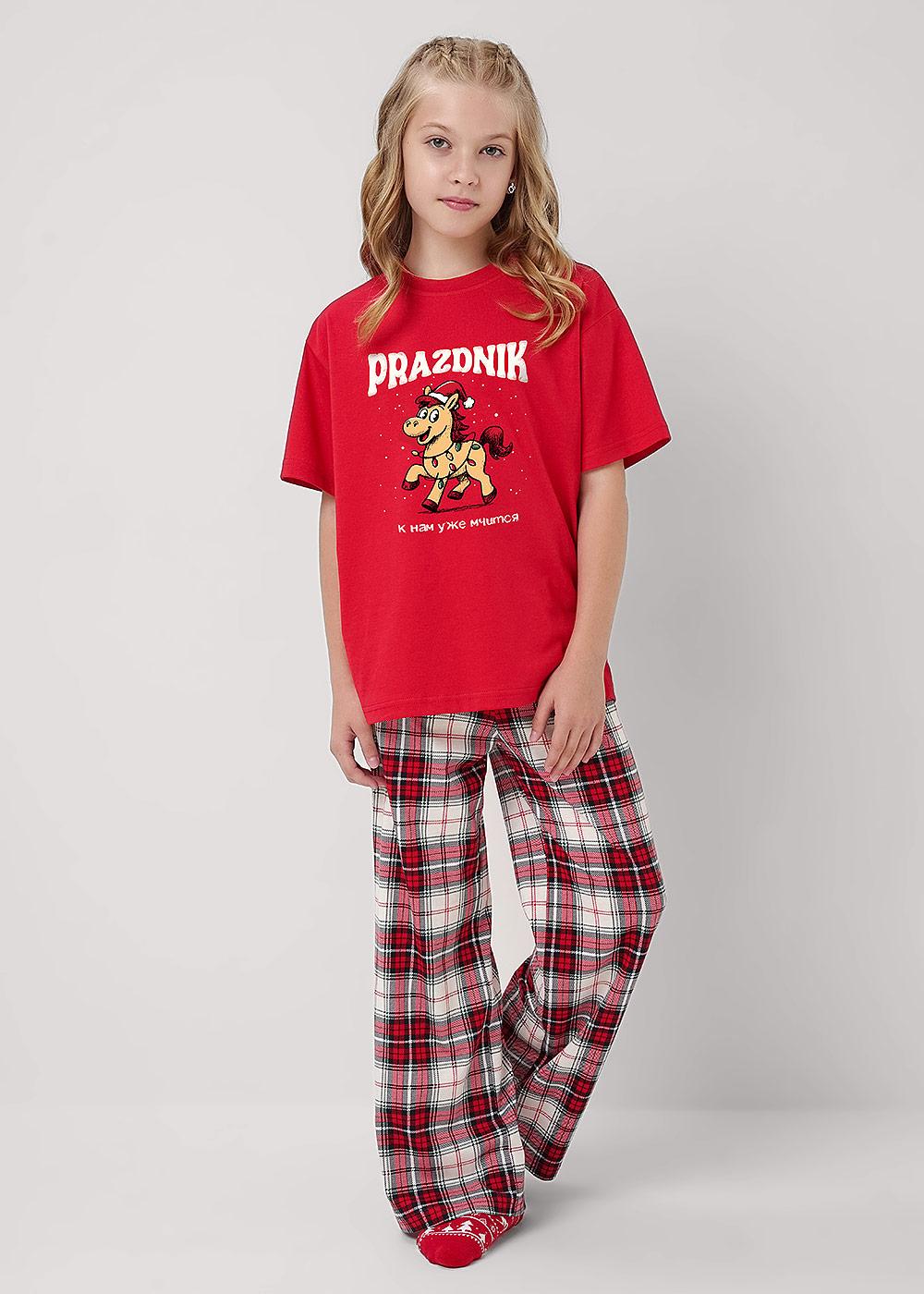"Описание: Новогодняя пижама для подростков,состоящая из футболки и брюк. Футболка свободного кроя спереди украшена милым тематическим принтом. Брюки прямые среднего объема с эластичным поясом.