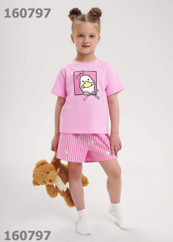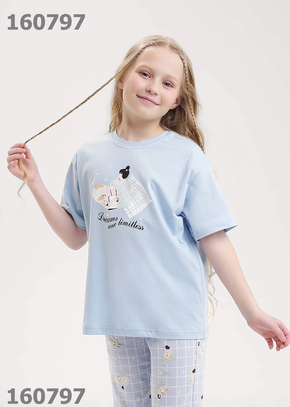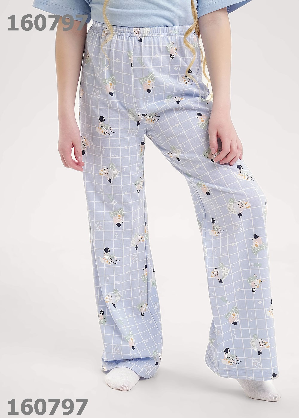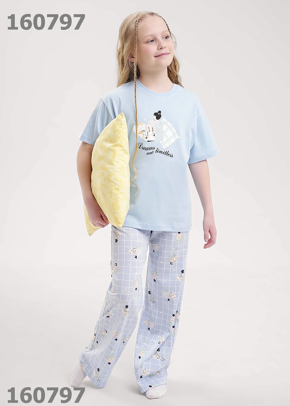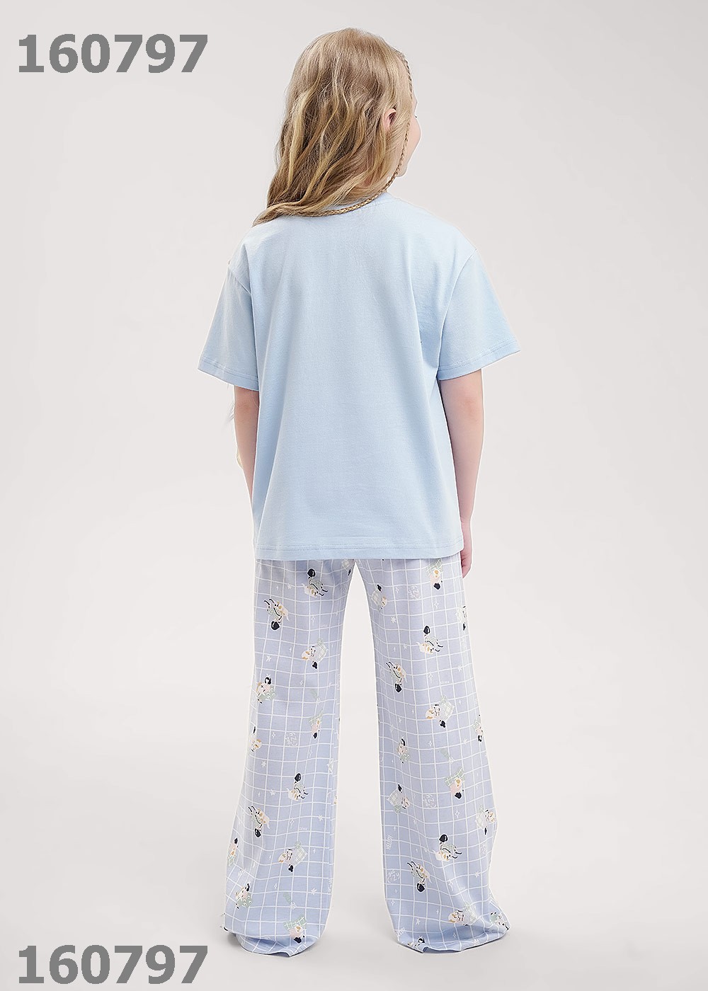 "Описание: Комплект хлопковой пижамы из футболки и брюк. Футболка свободного кроя дополнена эластичной горловиной и стильным принтом. Брюки среднего объема, эластичный пояс обеспечит комфорт и идеальную посадку, а стильная набивка подарит хорошее настроение.