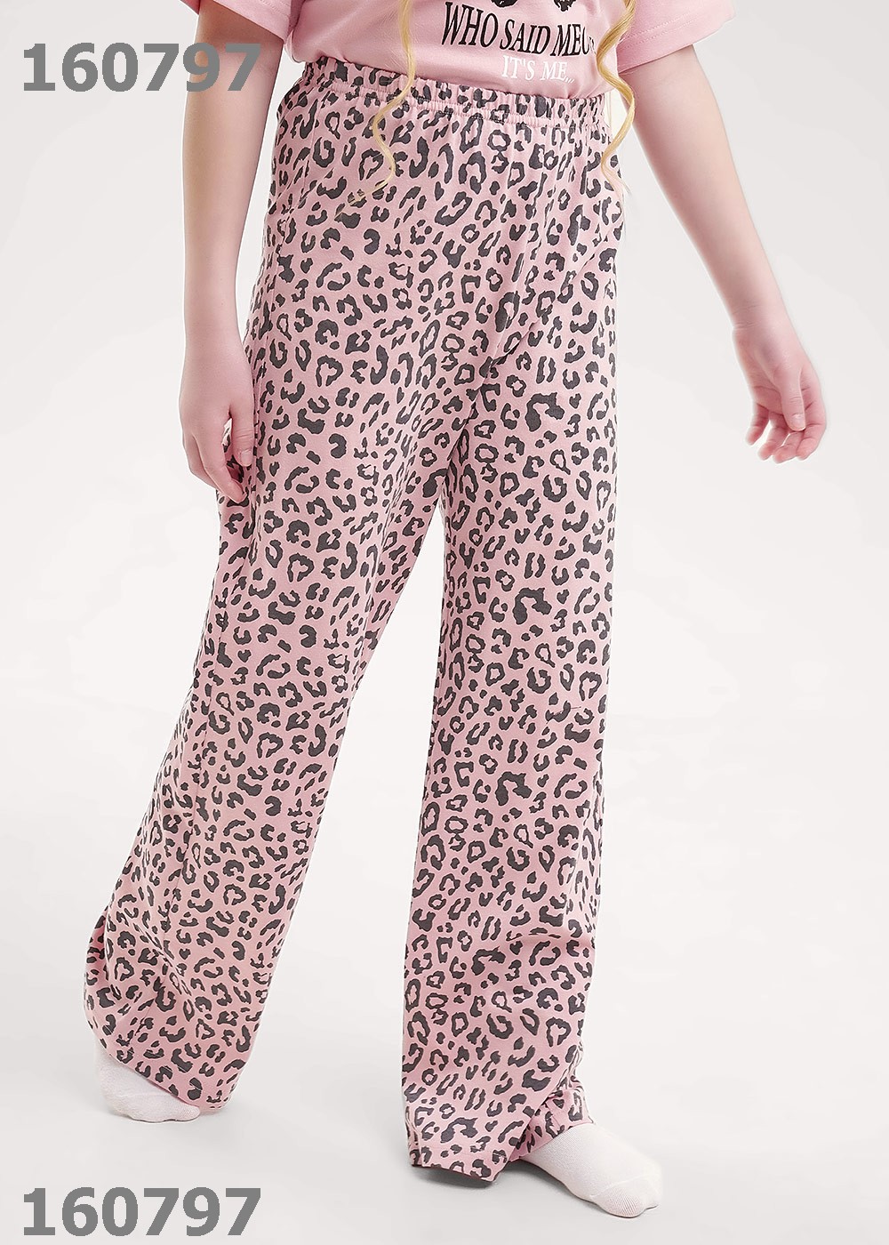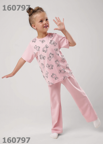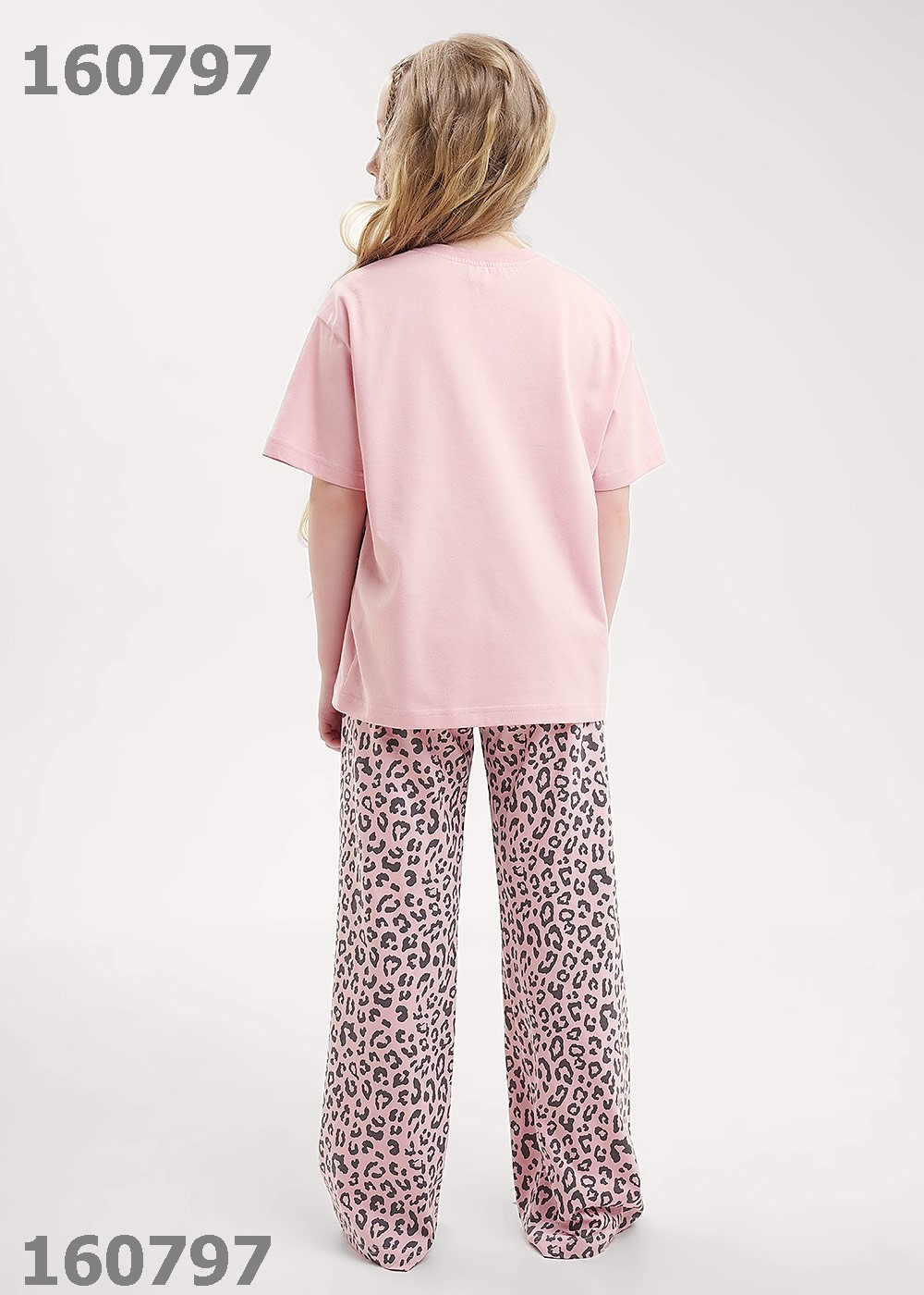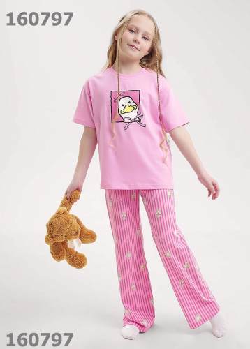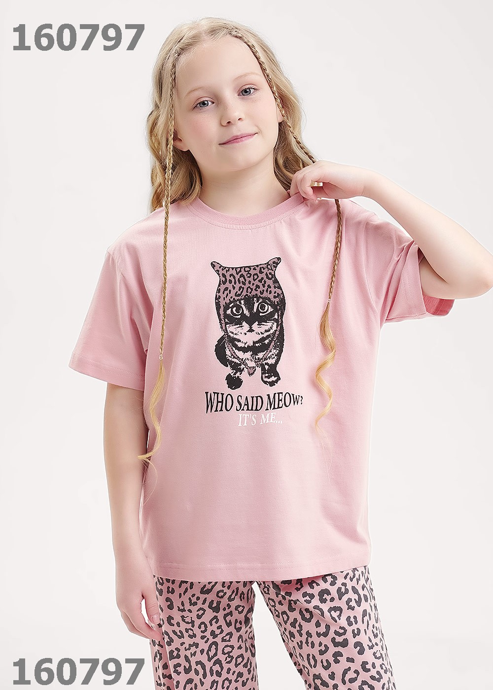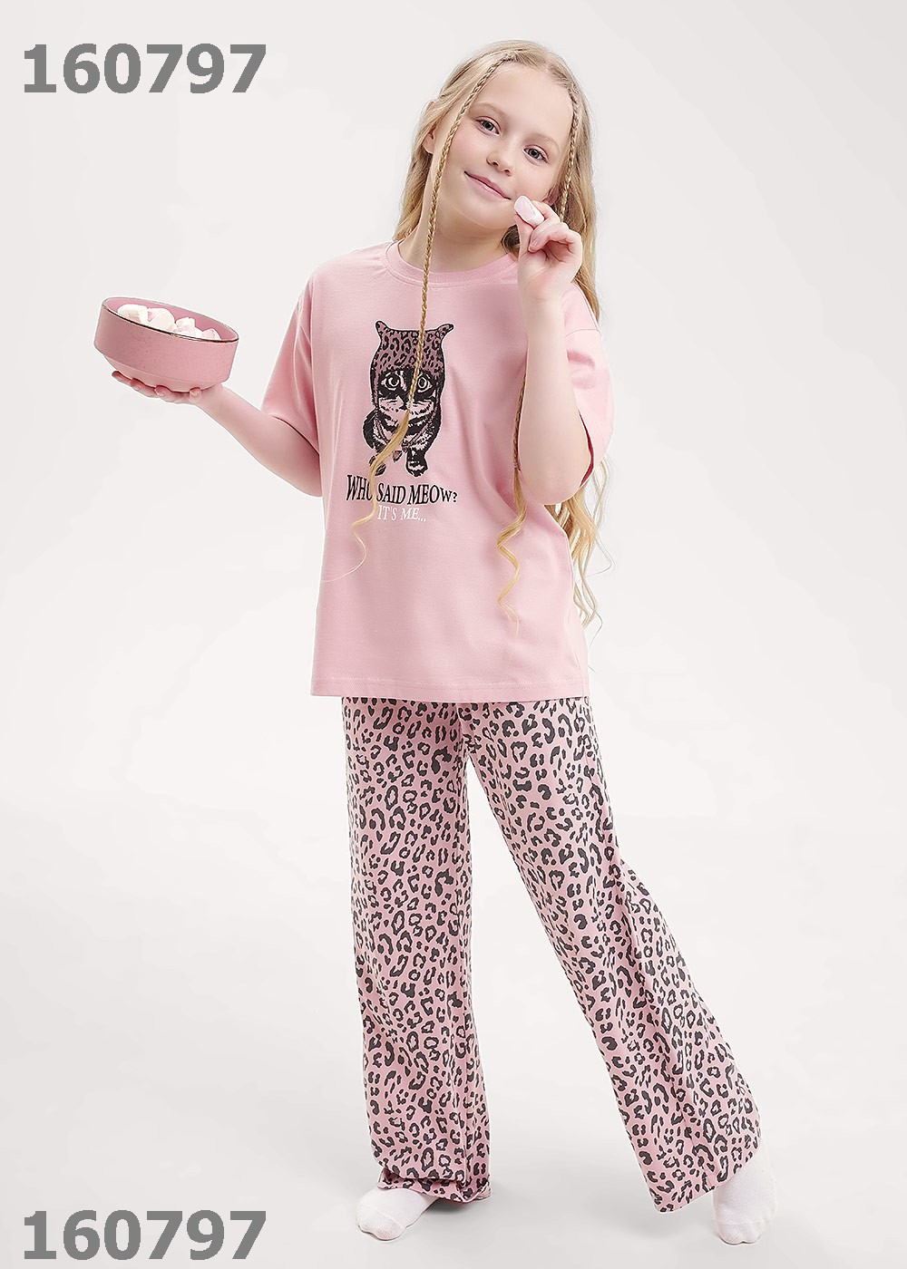 "Описание: Комплект хлопковой пижамы из футболки и брюк. Футболка свободного кроя дополнена эластичной горловиной и стильным принтом. Брюки среднего объема, эластичный пояс обеспечит комфорт и идеальную посадку, а стильная набивка подарит хорошее настроение.