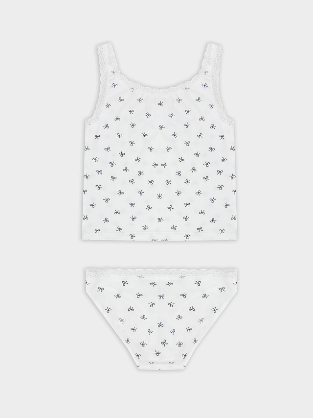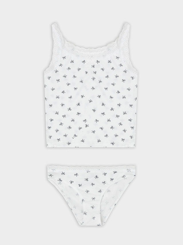 Верхний край трусиков украшен таким же нежным кружевом, что и майка, а бантик завершает гармоничный дизайн.