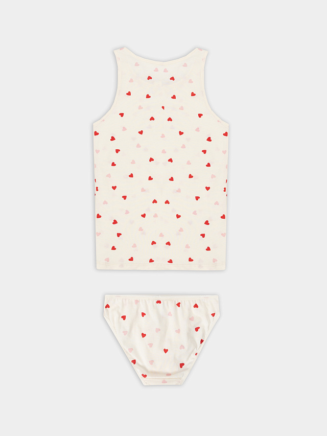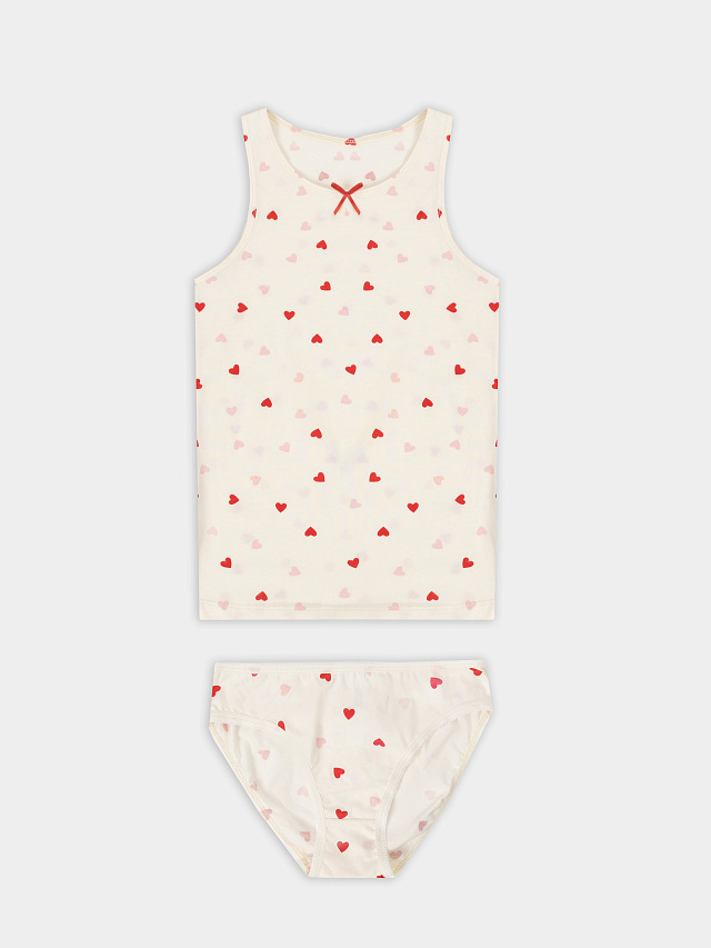 Нежные сердечки на белом фоне добавляют образу трогательности, а плоские швы исключают натирание. Этот комплект нижнего белья подойдет для садика, школы или сна — он не заметен под одеждой и сохраняет опрятность даже при активном движении.