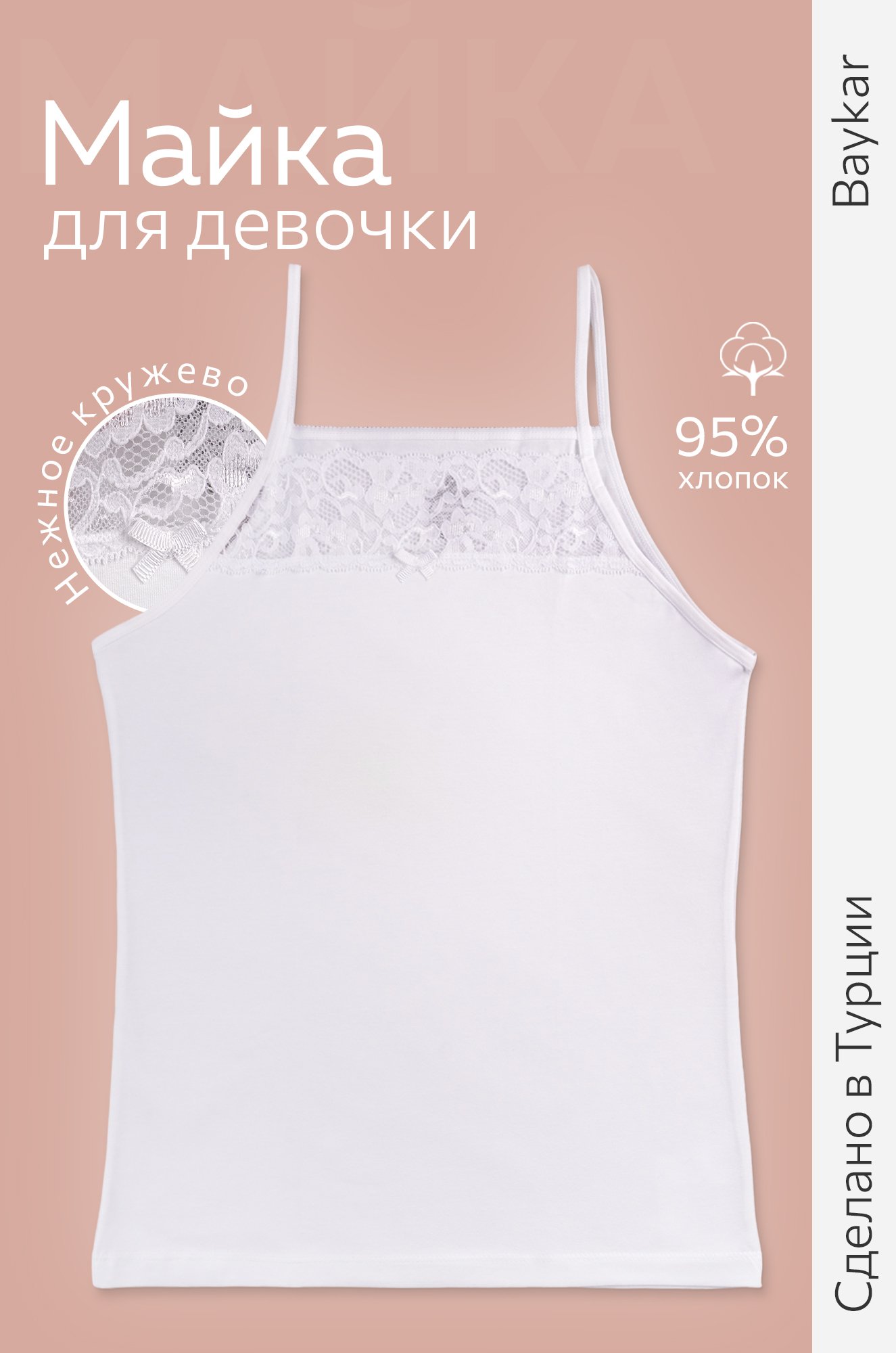 Детская майка для девочки и девочек подростков выполнена из мягкого трикотажного хлопка с добавлением эластана. Классическая белая маечка на тонких бретельках украшена широким эластичным кружевом и атласным бантиком.