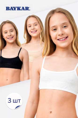 Черный, белый и бежевый топики для девочки — готовый набор из 3-х штук для детей и подростков! Однотонный детский бюстик станет её маленьким секретом комфорта. Широкие лямки и аккуратный вырез создают милый образ, а атласный бантик добавляет трогательную изюминку. Эластичные бейки и короткий крой делают топы невероятно удобными.