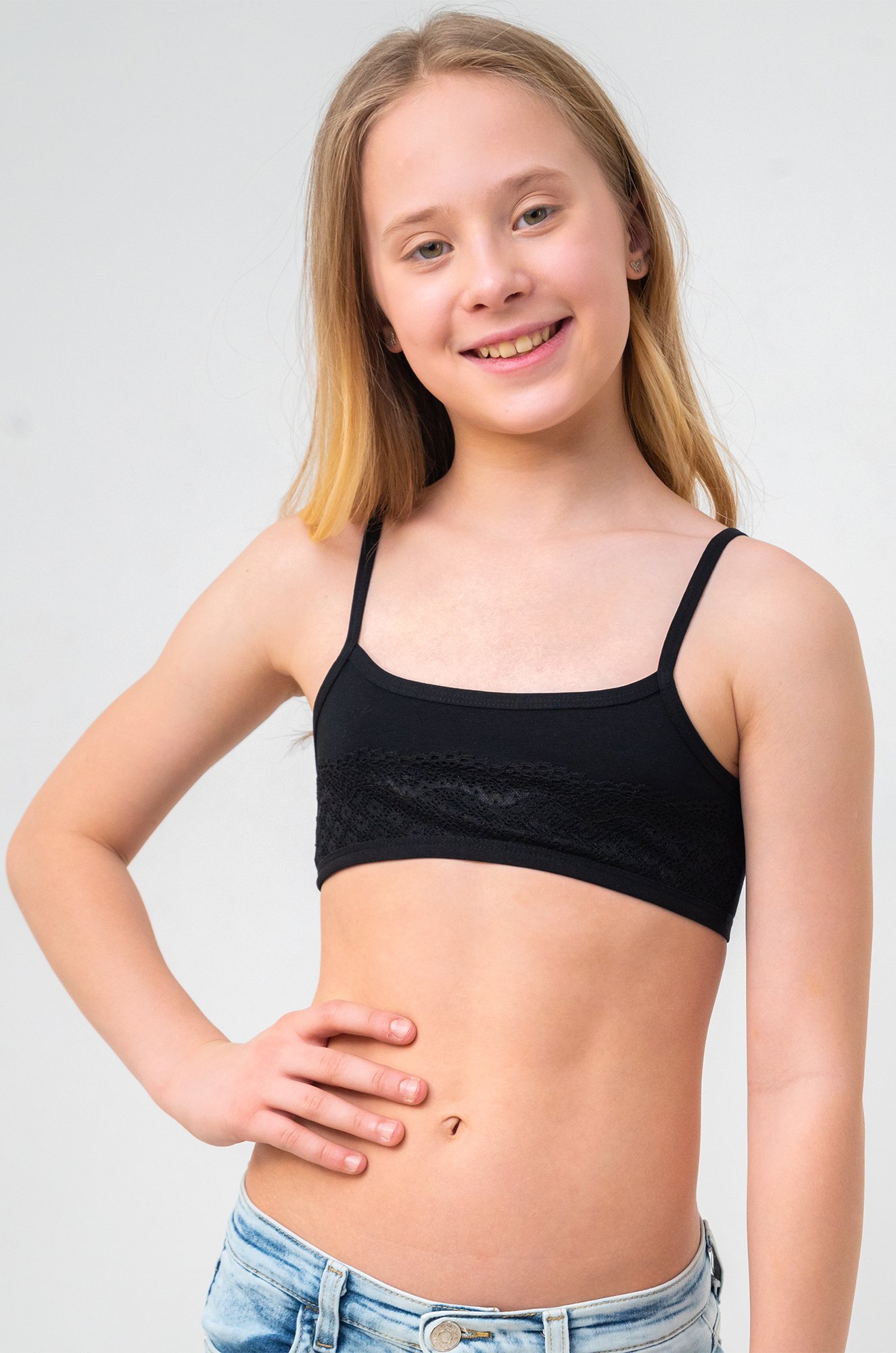 Черный топик для девочки и девочки-подростка создаст основу для идеального повседневного комфорта. Облегающий крой детского бюстика на тонких бретелях придаст комфортную посадку, а нежное кружево добавит образу милой изюминки.