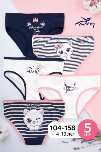 Набор детских трусов слипов 5 штук для девочек – комфортная база на каждый день. Трусики-слипы отлично тянутся и аккуратно сидят на теле. Базовые трусы для детей и подростков представлены в черно-белой цветовой гамме и украшены принтом котики.