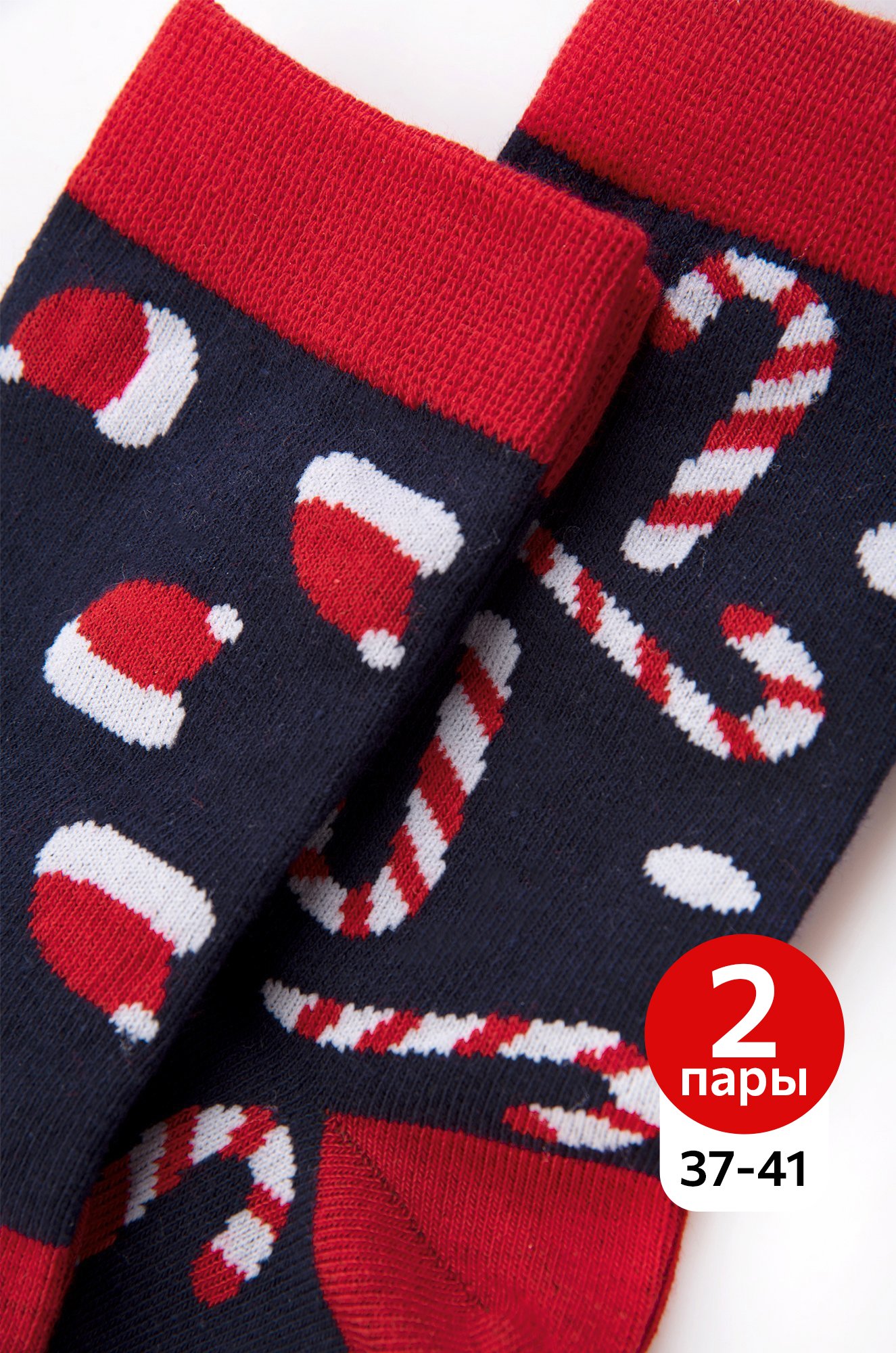 Набор женских носков с новогодним рисунком 2 пары из нежного хлопка – важный атрибут праздничного настроения. Новогодние носки выполнены в сине-красной цветовой гамме и украшены узором новогодние колпаки и карамельная трость. Высокие носки идеальны в качестве подарка на Новый год и Рождество.
