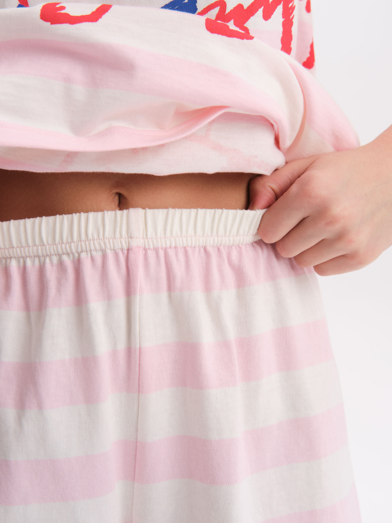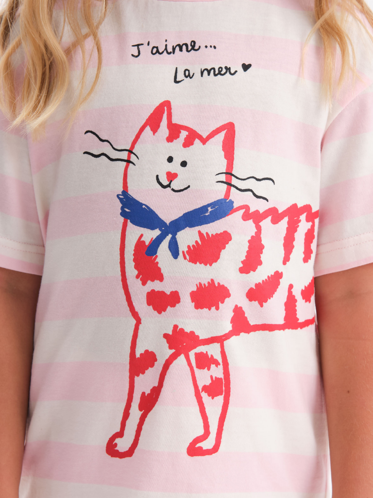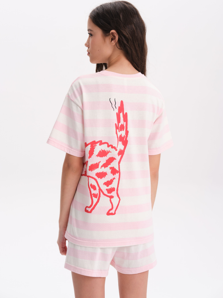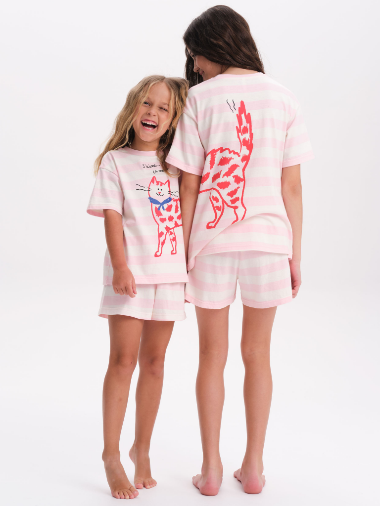 Стильная и уютная пижама актуального цвета для девочки. В составе ткани 100% хлопка — идеально для детской одежды! Модель приятна на ощупь, прекрасно пропускает воздух, позволяя коже ребёнка дышать. При этом в пижаме из хлопка ребёнку будет уютно, даже если он сбросит одеяло. Всё это обеспечивает комфортный и качественный сон. Свободная футболка и комфортные шорты, плечо немного спущено, рукава широкие — в пижаме очень удобно спать. Широкая и мягкая резинка в поясе не перекручивается и не давит. Отделка горловины из эластичной рибаны — она не растягивается, ребёнку удобно надевать и снимать пижаму. Футболку украшает позитивный принт в виде кошечки. Надпись переводятся: "люблю море". Домашний комплект — замечательный подарок дочке, внучке, сестре на любой праздник. Выбирайте нужный размер по таблице размеров на фото. Цвет товара на экране вашего устройства может отличаться от цвета изделия вживую. Состав: верх: 100%хлопок, низ: 100%хлопок Возрастная группа: Kids Сезон: Весна Год: 2025 Пол: Девочки