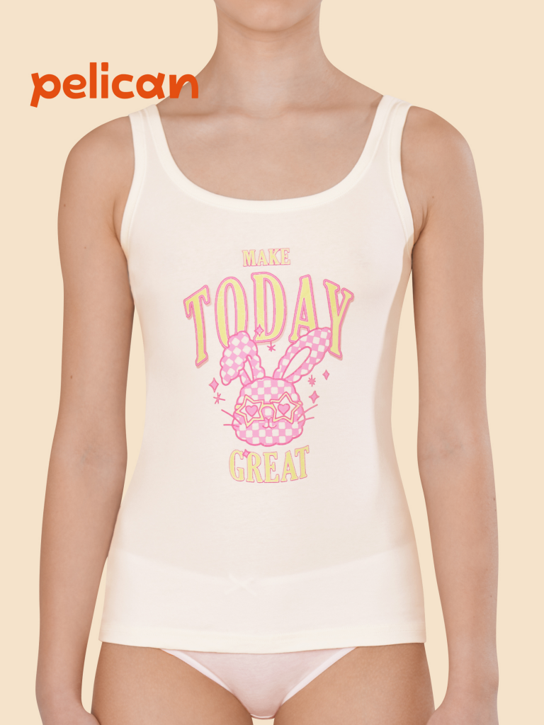 Майка детская для девочки в модном стиле преппи. Нательная майка для девочки выполнена из ткани с высоким содержанием хлопка — она приятна на ощупь, гипоаллергенна и великолепно пропускает воздух. Эластан помогает изделию сохранять отличную форму в течение длительного времени. Качественная ткань и правильный крой гарантируют комфортную посадку. Горловина и проймы обработаны эластичным пайпингом в тон — они не растягиваются и надолго сохраняют прекрасный внешний вид. Хлопковая майка белого цвета (нежный молочный оттенок) подойдёт любой девочке. Красивая майка декорирована позитивным принтом в виде зайчика в очках, надпись переводится: «сделай сегодняшний день отличным». Принт мягкий и устойчивый, отлично переносит стирки. Майка детская для девочек — идеальный выбор для повседневной носки под одеждой, а также она подходит для летнего отдыха и в качестве домашней одежды. Помните о правильном уходе за изделием: рекомендуется стирать при температуре не выше 30 °C, без предварительного замачивания, с изнанки. Это поможет сохранить качество и цвет майки на длительное время. Не забывайте о выборе правильного размера. Используйте таблицу размеров на фотографии, чтобы выбрать подходящий вариант для вашей девочки. Обратите внимание, что цвет товара на экране вашего устройства может отличаться от реального. Состав: 93%хлопок 7%эластан Возрастная группа: Kids Сезон: Осень Год: 2024 Пол: Девочки