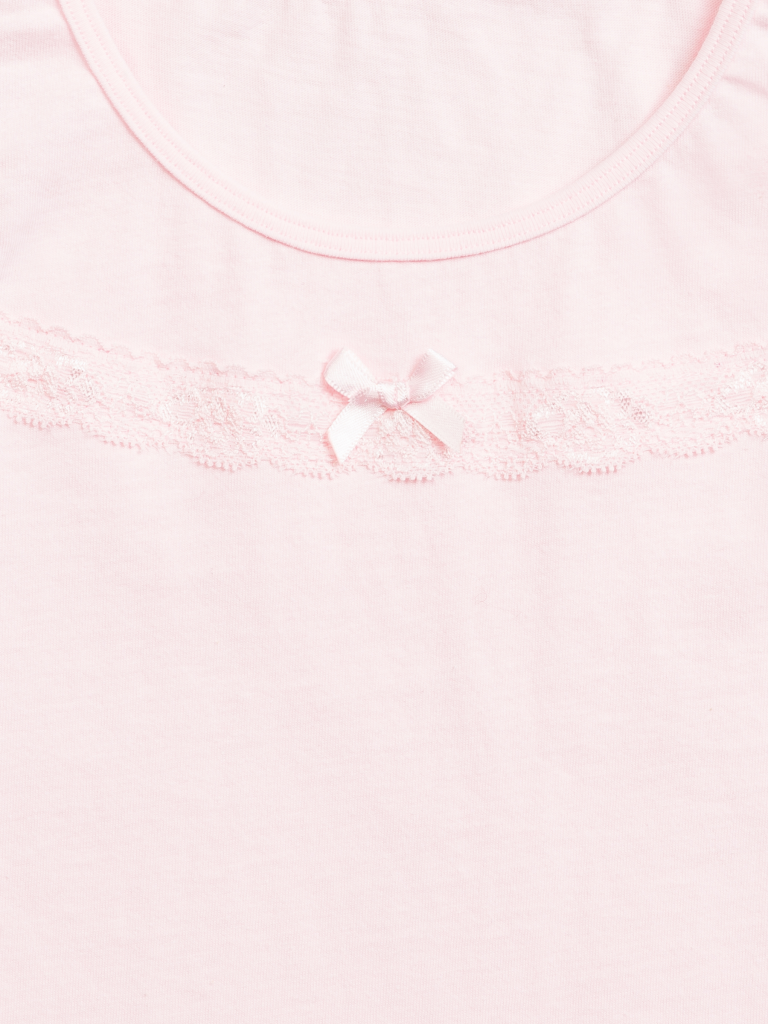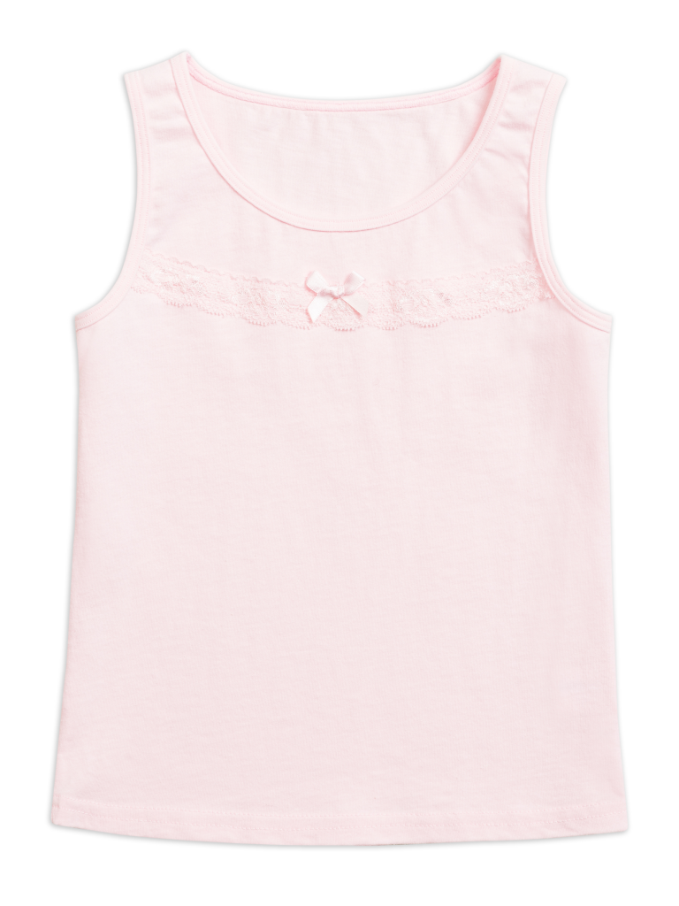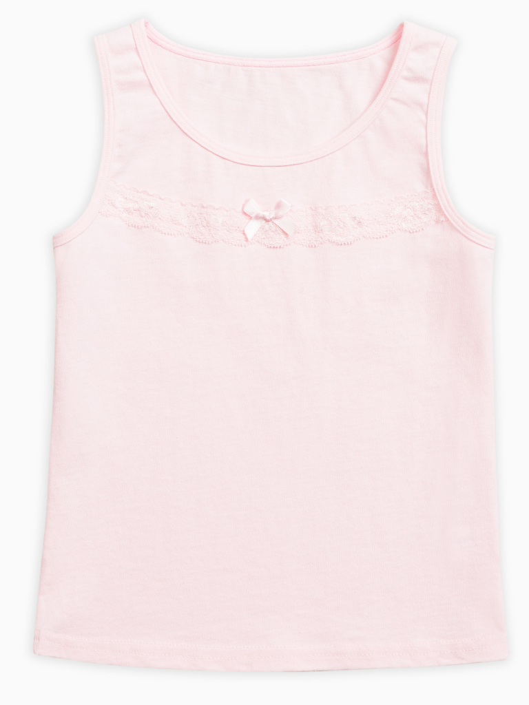 Майка для девочки. Майка изготовлена из 100% хлопка и не требует особого ухода, не линяет и не растягиваются после стирки. Классический крой, пастельные тона делают майку универсальной в носке: можно использовать как нательное белье, домашнюю одежду или как часть повседневного гардероба. Изюминка майки - декоративная лента из мягкого эластичного кружева и атласный бантик. Идеально для романтичных девочек. Состав: 100%хлопок, вставка: 90%нейлон 10%эластан Возрастная группа: Kids Сезон: Осень Год: 2019 Пол: Девочки