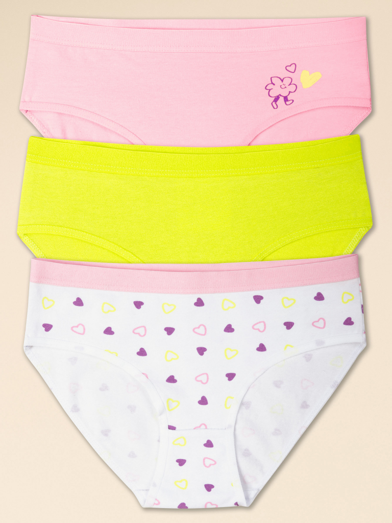 При выборе белья для своего ребёнка каждая мама хочет быть уверена в его качестве и в том, что ребёнку будет комфортно. Комплект трусов для девочки (3 шт.) полностью соответствует этим требованиям. Слипы средней посадки выполнены из ткани с высоким содержанием хлопка — модель мягкая, прекрасно пропускает воздух, давая коже ребёнка дышать. Благодаря эластану в составе изделие надолго сохраняет отличную форму, даже после многочисленных стирок. Качественная ткань и анатомически правильный крой обеспечивают идеальную посадку на теле — ребёнку комфортно на протяжении всего дня. Мягкая резинка исключает раздражение и трение. Трусы детские для девочки представлены в трёх актуальных вариантах расцветки: зелёный (трендовый оттенок лайма), белый в мелкие разноцветные сердечки и розовый с небольшим принтом в виде забавной ромашки с ножками и сердечек. Принт эластичный и стойкий, отлично переносит частые стирки. В линейке представлены хлопковые трусы следующих размеров: 1 (86): 2 (92): 3 (98): 4 (104): 5 (110): 6 (116): 7 (122): 8 (128): 9 (134): 10 (140): 11 (146). Модель подходит девочкам дошкольного возраста, девочкам младшего школьного возраста и девочкам-подросткам. Трусы слипы для девочки — идеальный выбор детского белья для повседневной носки. Модные трусы станут хорошим подарком дочери или внучке на любой праздник. Выбирайте нужный размер по таблице размеров на фото. Цвет товара на экране вашего устройства может отличаться от цвета изделия вживую. Товар возврату и обмену не подлежит. Состав: низ: 93%хлопок 7%эластан, низ2: 93%хлопок 7%эластан, низ:3 93%хлопок 7%эластан Возрастная группа: Junior Сезон: Весна Год: 2024 Пол: Девочки