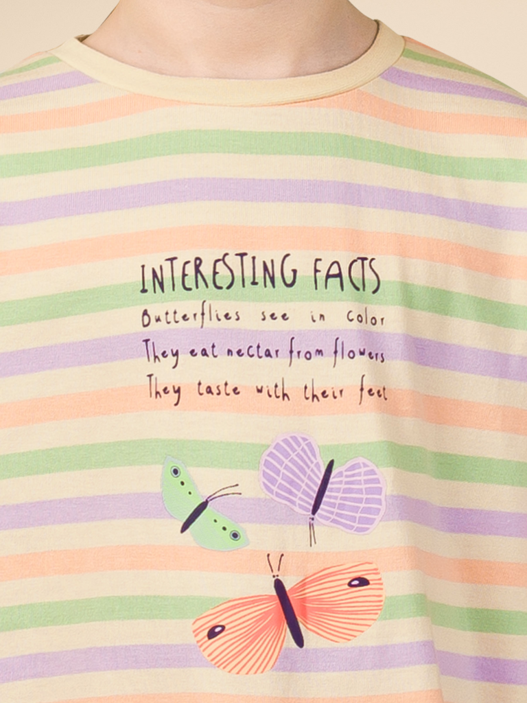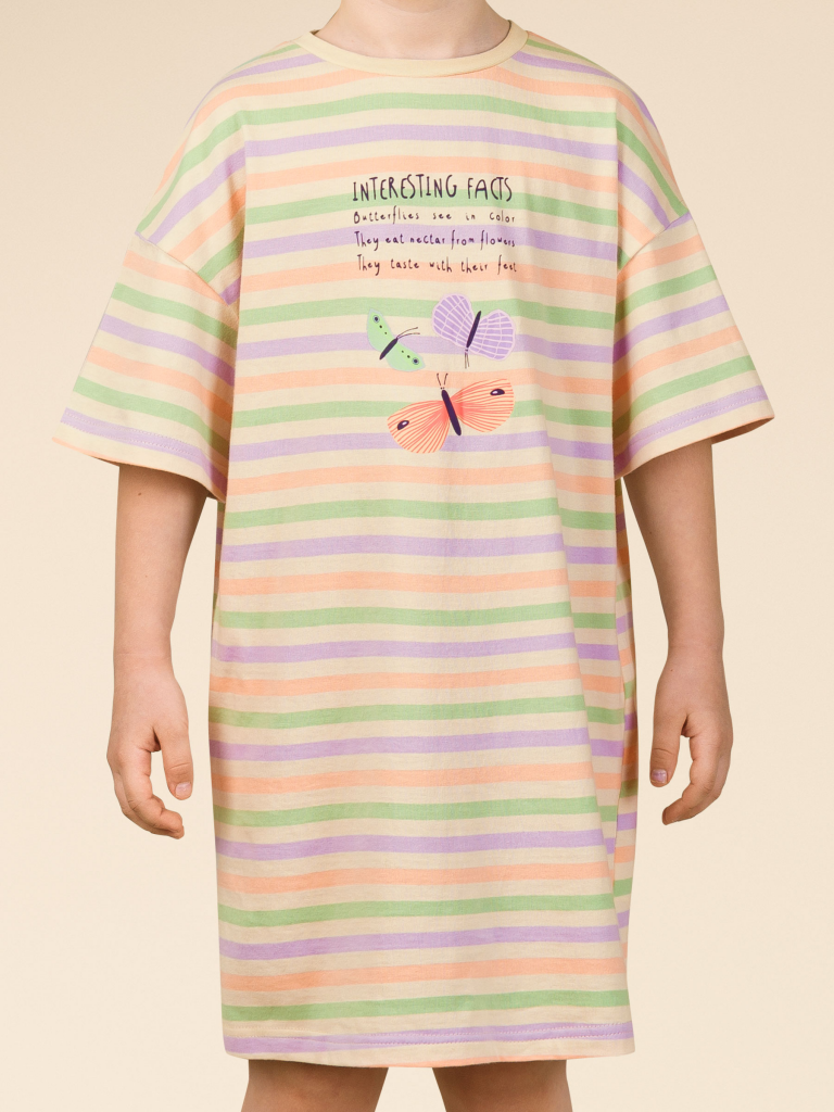 Стильная и уютная ночная сорочка для девочки в нежных пастельных оттенках. В составе ткани 100% хлопка — идеально для детской одежды! Модель приятна на ощупь, прекрасно пропускает воздух, позволяя коже ребёнка дышать. При этом в ночной рубашке из хлопка ребёнку будет уютно, даже если он сбросит одеяло. Всё это обеспечивает комфортный и качественный сон. Сорочка для девочки свободная, плечо немного спущено, рукава широкие — в ней очень удобно спать. Отделка горловины из эластичной рибаны — она не растягивается, ребёнку удобно надевать и снимать рубашку. Домашнее платье в полоску украшает милый принт в виде бабочек. Надписи переводятся: "интересные факты", "бабочки видят в цвете", "они питаются нектаром с цветов", "вкусовые рецепторы у них находятся на лапках". В линейке представлены следующие размеры: 2 (92): 3 (98): 4 (104): 5 (110): 6 (116), 7 (122): 8 (128): 9 (134): 10 (140): 11 (146). Сорочка рубашка идеальна для сна и отдыха дома — прекрасный выбор для вашего ребёнка! Ночная сорочка с принтом подходит для круглогодичного использования. Сорочка детская для девочки — замечательный подарок дочке, внучке, сестре на любой праздник. Выбирайте нужный размер по таблице размеров на фото. Цвет товара на экране вашего устройства может отличаться от цвета изделия вживую. Товар возврату и обмену не подлежит. Состав: 100%хлопок Возрастная группа: Kids Сезон: Весна Год: 2024 Пол: Девочки