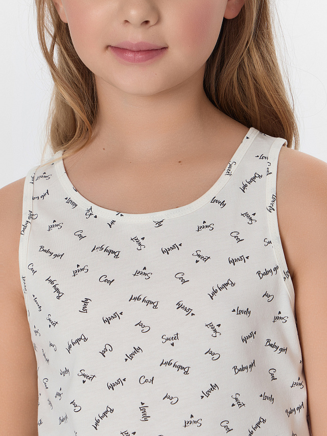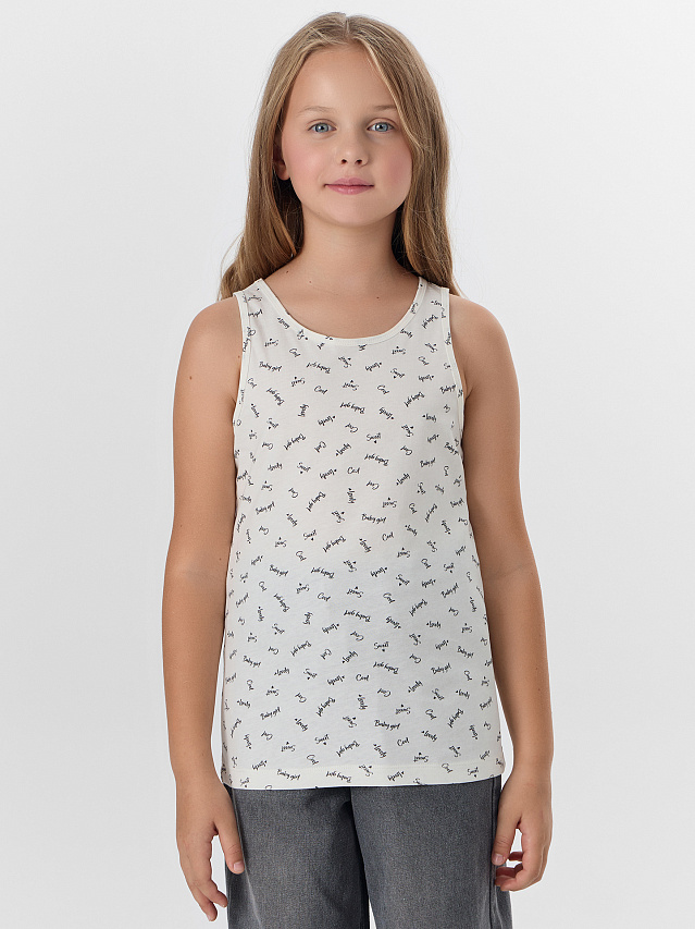 Майка для девочек, выполненная из трикотажной кулирки. Длина до середины бедер. Силуэт полуприлегающий. Горловина круглая. Универсальная майка!