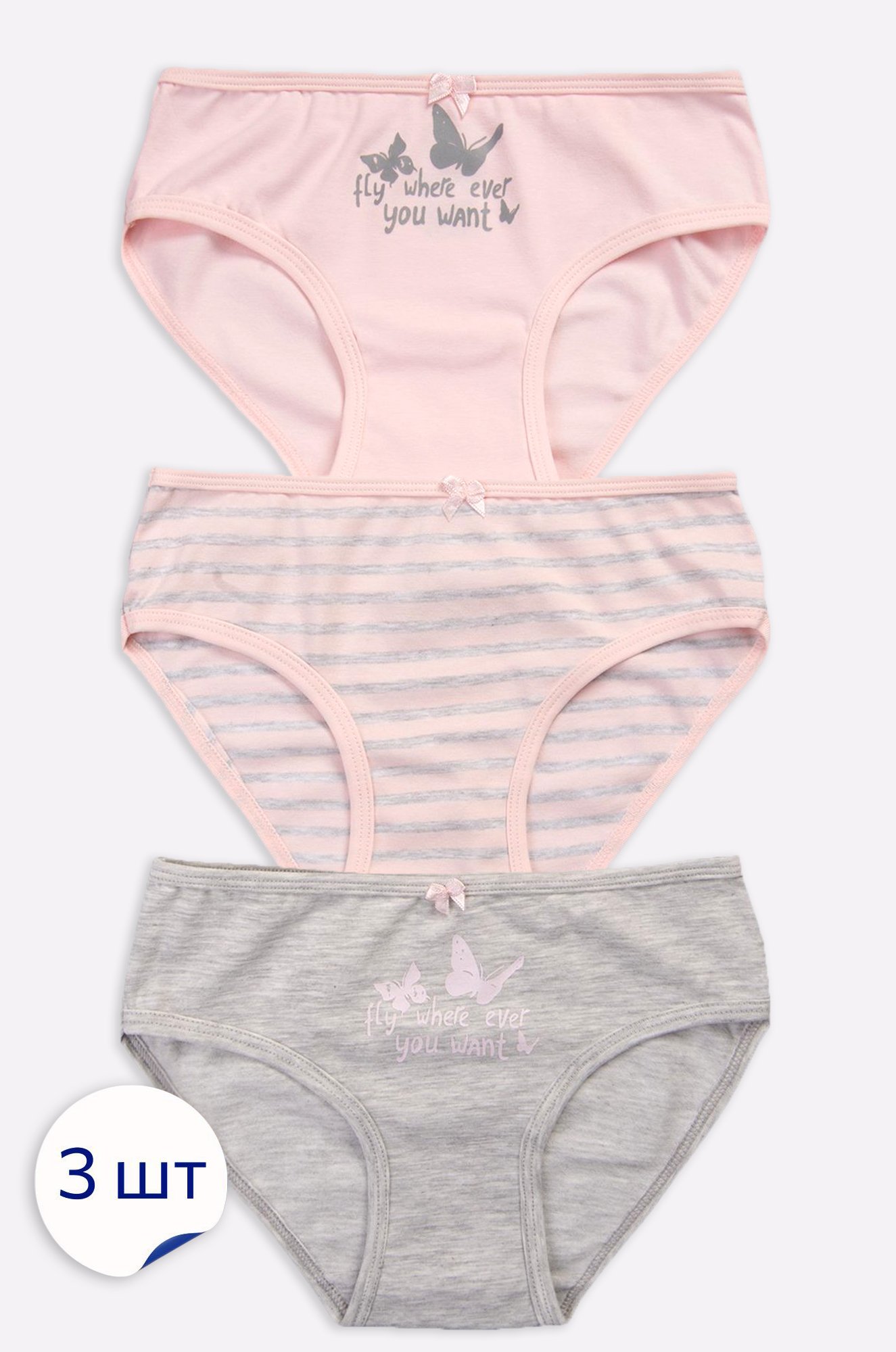 Комплект трусов из турецкого трикотажа 3 шт. отлично подходит для сна, домашнего отдыха и активных школьных будней. Трусики средней посадки идеальны для дома и в детский сад. 95% хлопок, 5% эластан