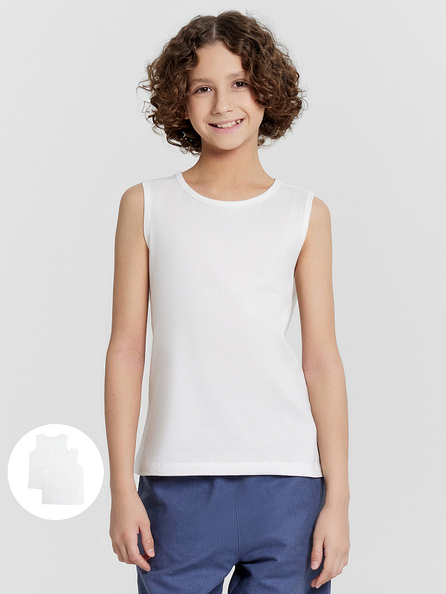 Набор из двух маек полуприлегающего силуэта из хлопковой трикотажной кулирки. Длина до середины бедер. Горловина круглая, окантована мягкой бейкой. Нижний срез обработан плоским швом. Комфортная классика для вашего мальчика!