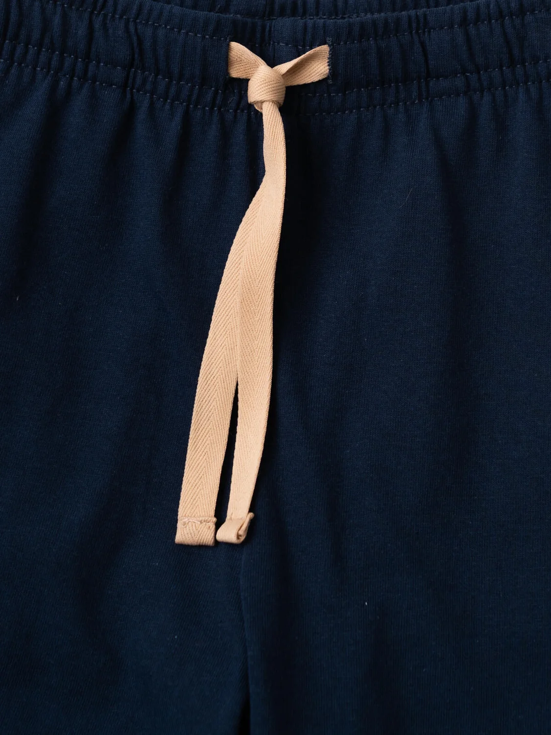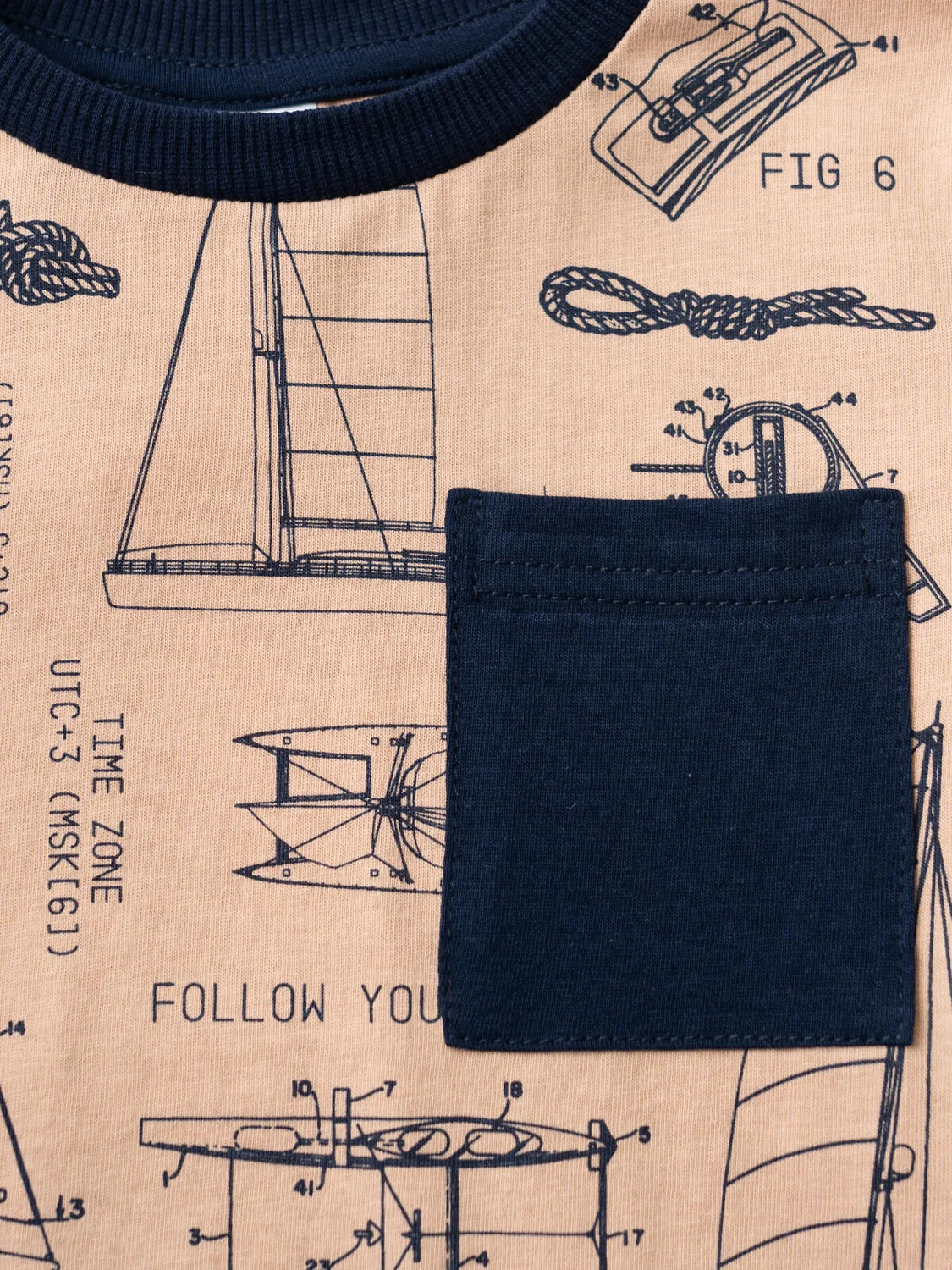 Пижама для мальчика подростка. Комплект состоит из футболки оверсайз с короткими рукавами и длинных брюк. Материал - мягкий хлопковый трикотаж. Верхняя часть выполнена в песочном цвете с ярким принтом в морской тематике — яхты, схемы и надписи. На груди расположен тёмно-синий накладной карман, который сочетается по цвету с отделкой воротника и самими брюками. Брюки прямого покроя, на эластичном поясе с декоративным шнурком.