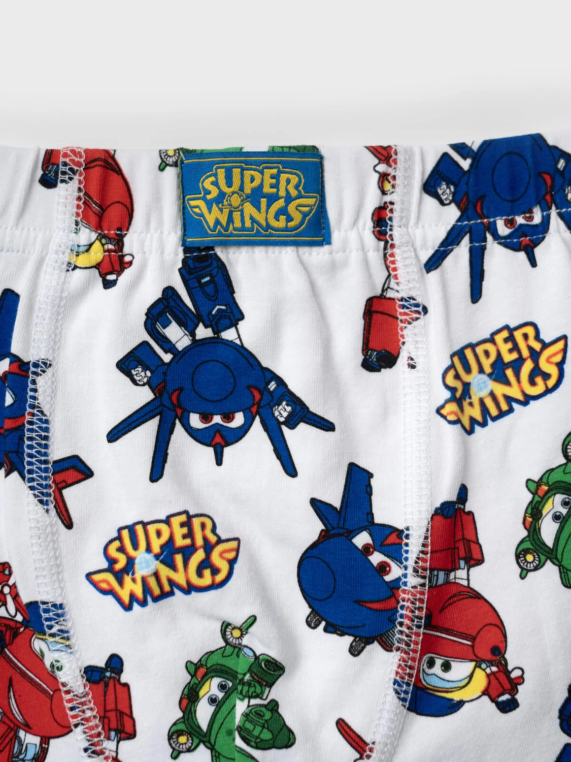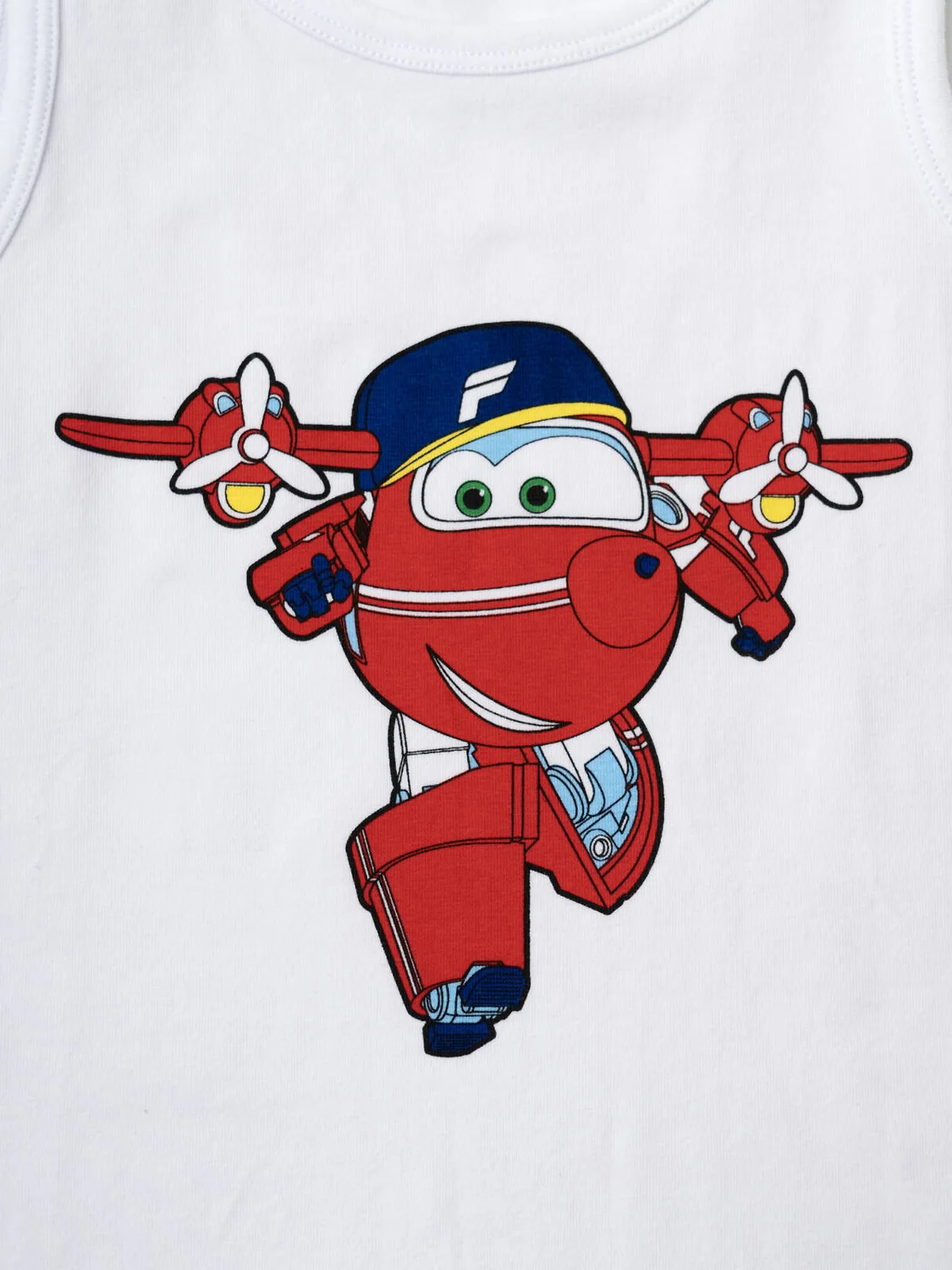 Детский комплект для мальчика из майки и трусов-боксеров. Майка белого цвета с ярким рисунком героя из мультфильма Super Wings спереди, трусы с таким же мультяшным принтом. У майки круглый вырез. Боксеры — удобного кроя, с эластичным поясом. Фирменные лейблы Super Wings. Комплект выполнен из приятного хлопкового трикотажа.