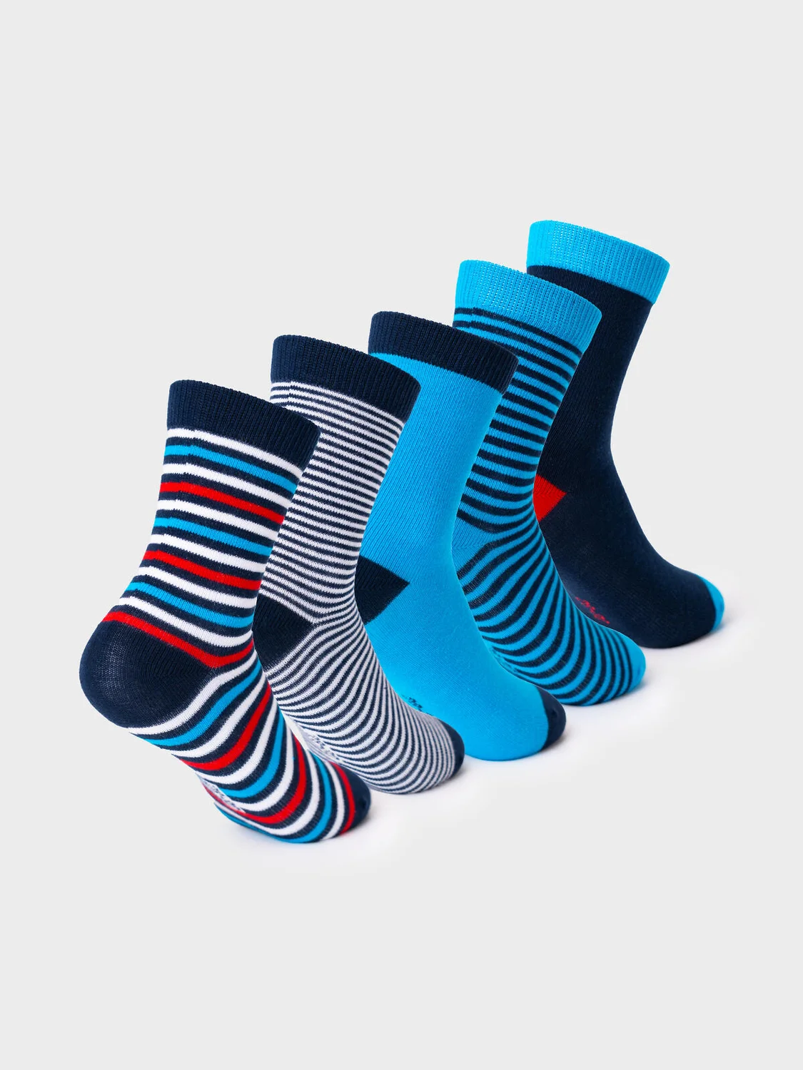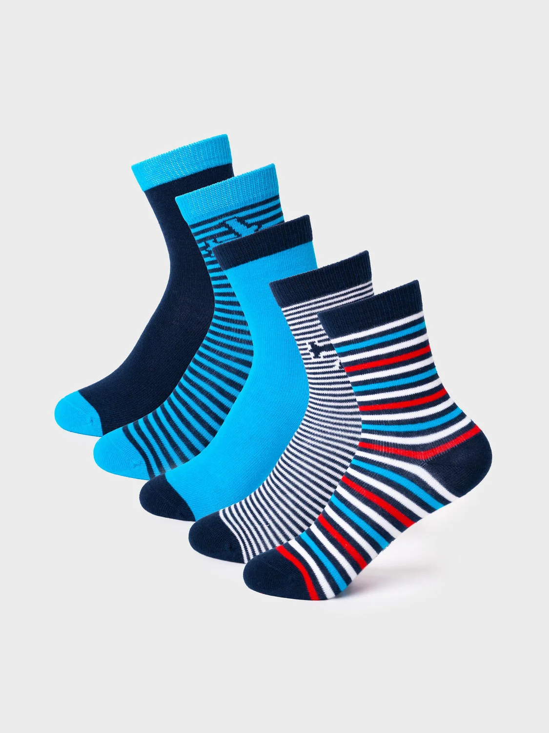 Набор из пяти пар детских носков для мальчика. В комплект входят модели с полосками, однотонные и с изображением самолёта. Удобная резинка не сдавливает ногу, а на стопе — аккуратная жаккардовая надпись с размером. Материал — мягкий хлопковый трикотаж.