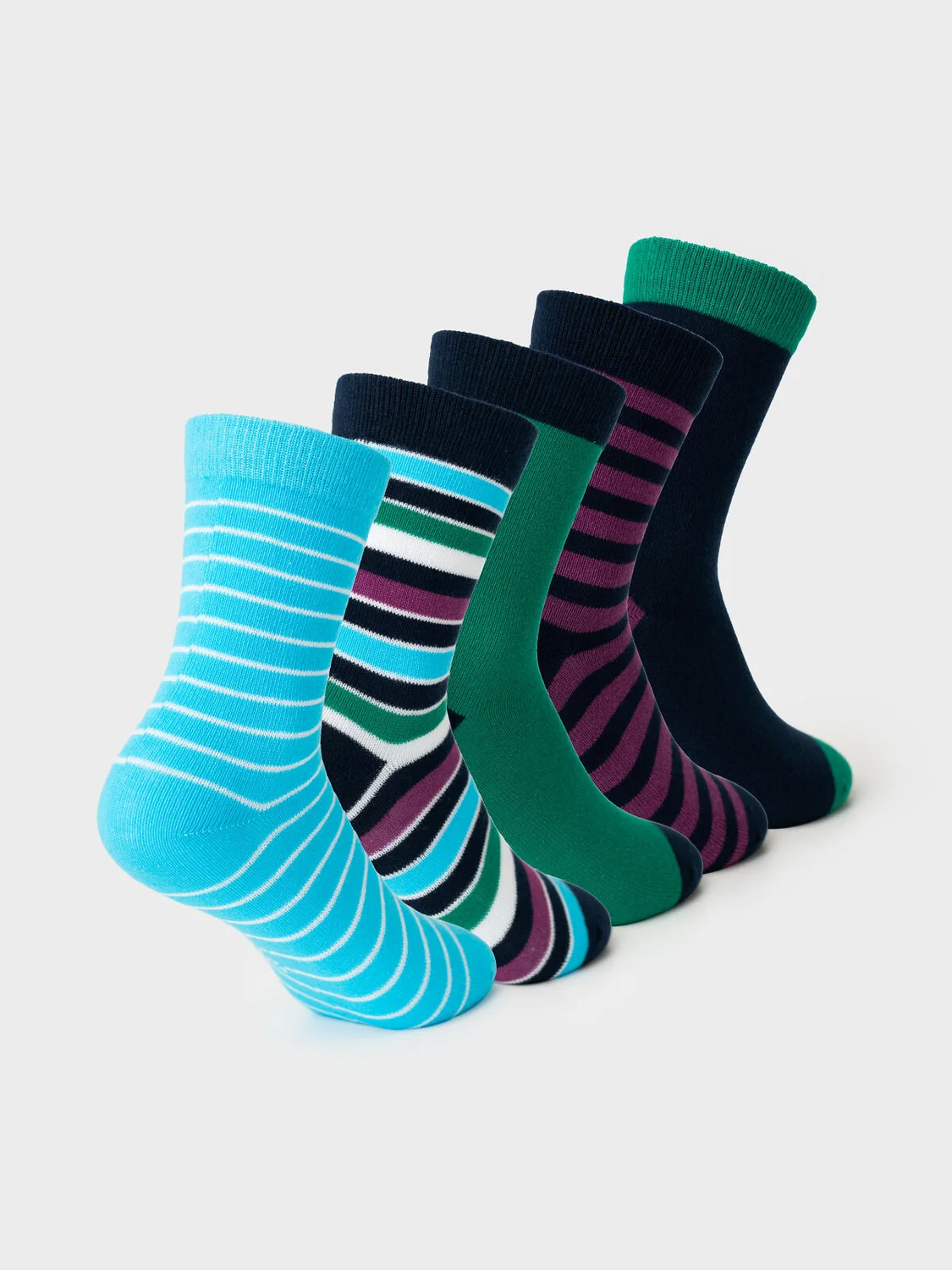 Набор из пяти пар детских носков для мальчика. В комплект входят модели с полосками, однотонные и с изображением зайчика. Удобная резинка не сдавливает ногу, а на стопе — аккуратная жаккардовая надпись с размером. Материал — мягкий хлопковый трикотаж.
