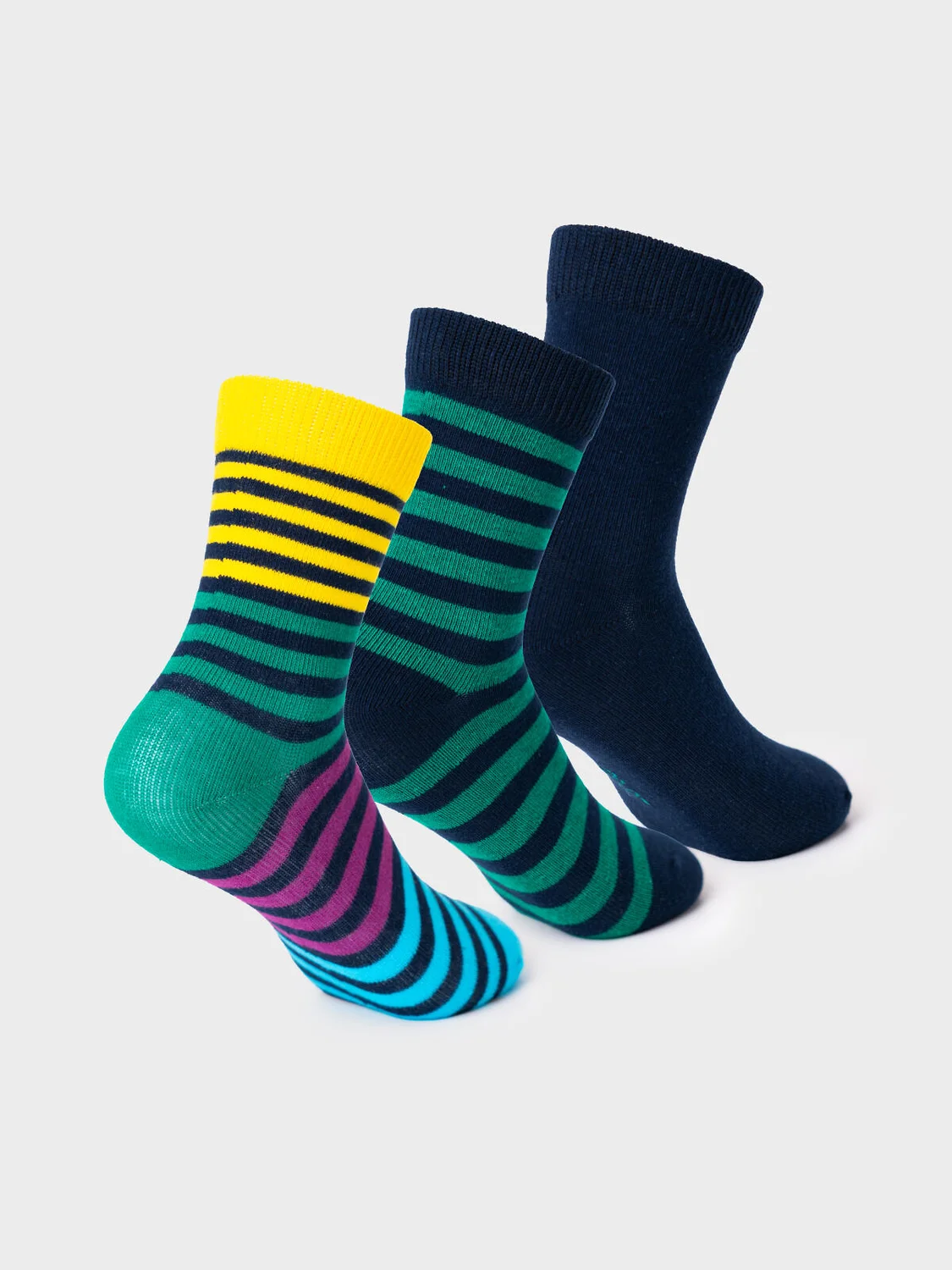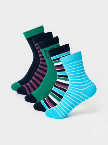 Набор из трех пар детских носков для мальчика. В комплект входят модели с полосками, однотонные и с принтом. Удобная резинка не сдавливает ногу, а на стопе — аккуратная жаккардовая надпись с размером. Материал — мягкий хлопковый трикотаж.