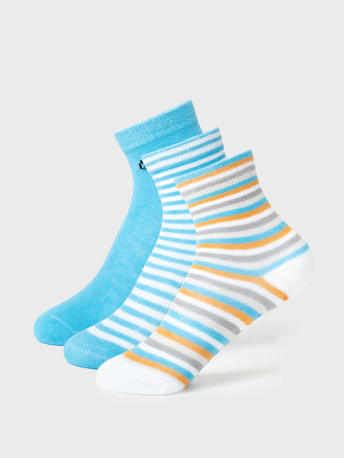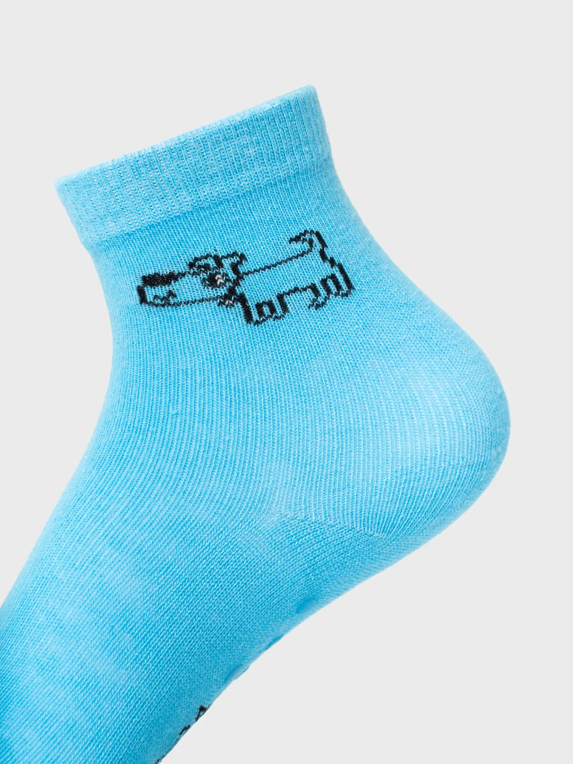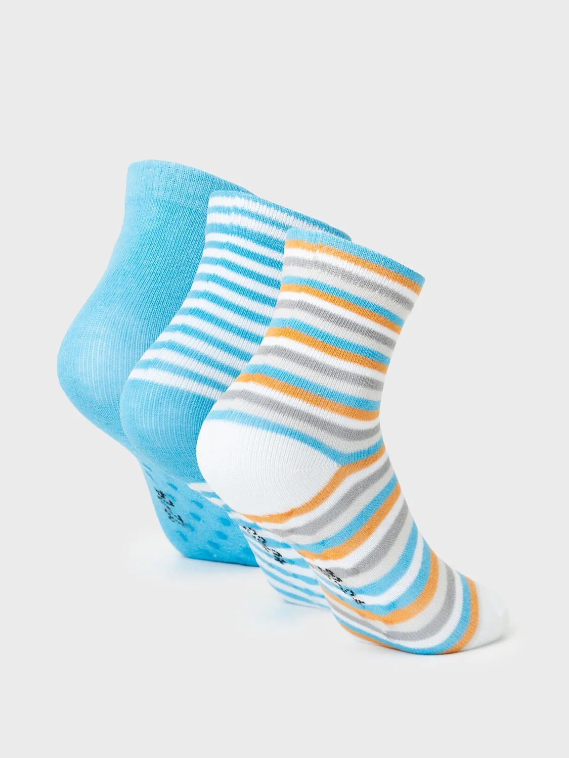 Набор детских носков для мальчика. В комплект входят три пары детских носков. Каждая пара выполнена в разном дизайне: однотонная с рисунком собаки и две в полоску с разными цветами. Все носки оснащены силиконовыми противоскользящими стопперами на подошве. Манжеты мягкие и эластичные, хорошо удерживают носок на ноге. Материал — мягкий хлопковый трикотаж.