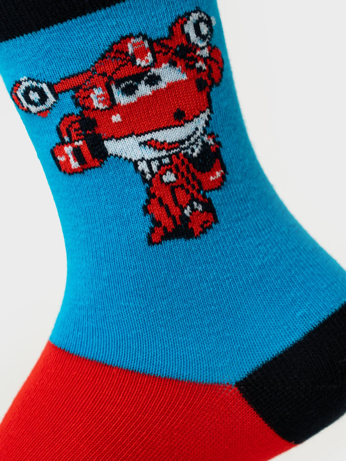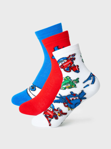 Набор из трех пар детских носков с яркими принтами персонажей Super Wings для мальчика. Удобная резинка не сдавливает ногу, а на стопе — аккуратная жаккардовая надпись с размером. Материал — мягкий хлопковый трикотаж.