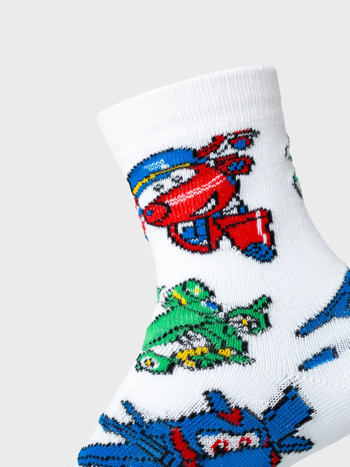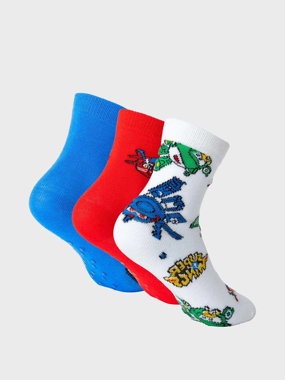 Набор детских носков с нескользящей подошвой для мальчика. Комплект из трёх пар детских носков. В комплекте три дизайна: белые с яркими принтами персонажей Super Wings, однотонные синие с мультяшным глазом и красные с небольшими вышивками самолётов. На подошве у всех носков есть силиконовые стопперы для безопасности. Удобный эластичный верх хорошо фиксирует носки, не сдавливая ногу. Размеры указаны на стопе. Материал — мягкий хлопковый трикотаж.