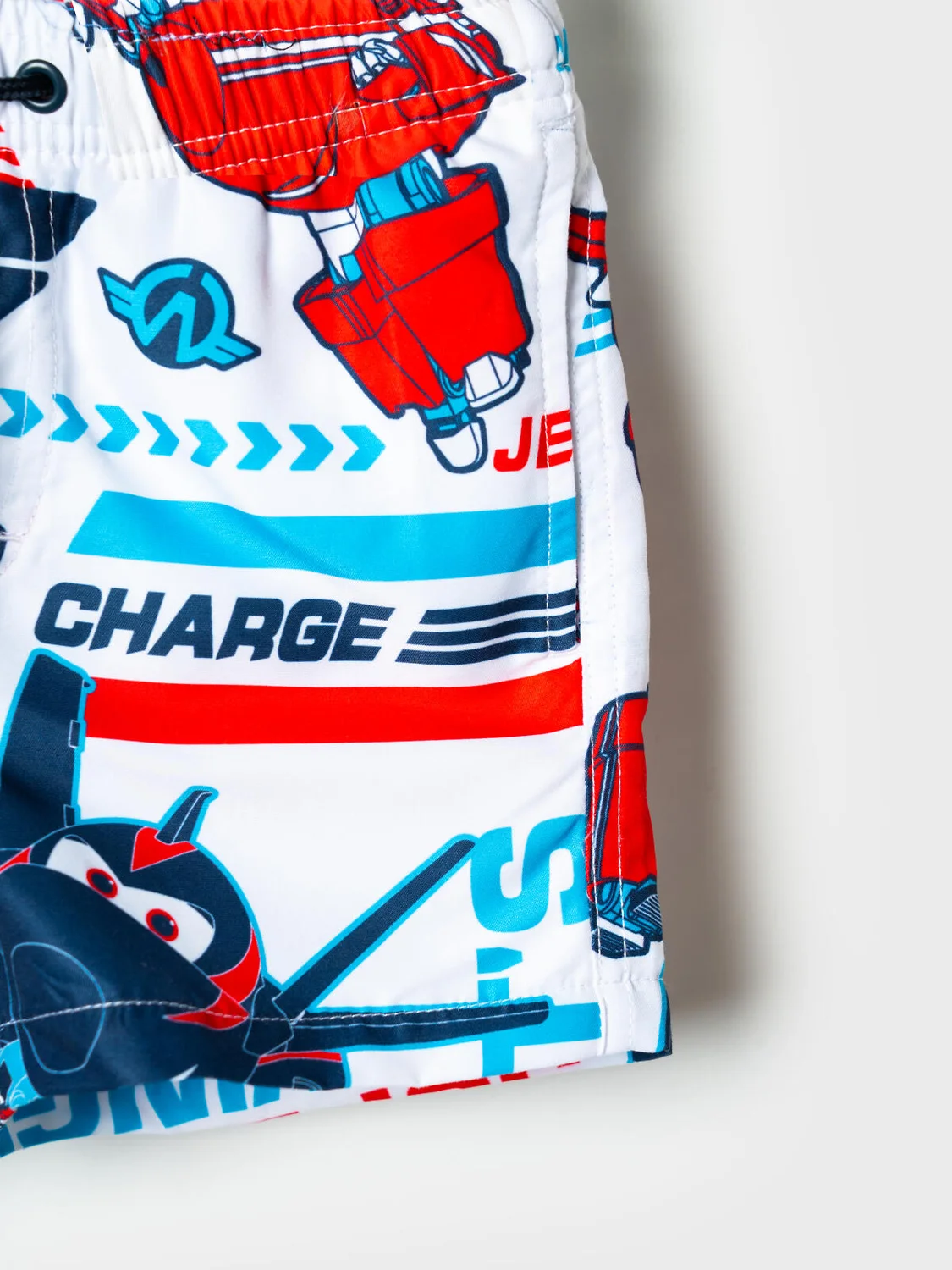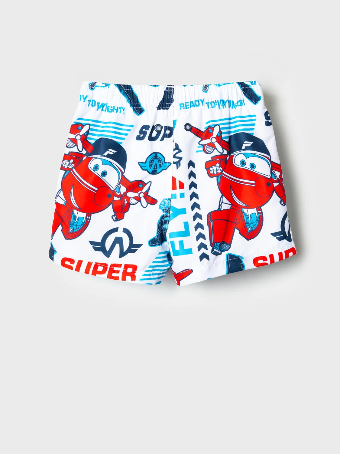 Детские плавательные шорты для мальчика. Модель средней длины с ярким принтом Super Wings. Изделие выполнено из лёгкой быстросохнущей ткани и дополнено внутренней сетчатой подкладкой. Пояс на резинке регулируется шнурком для комфортной посадки. Боковые сетчатые карманы.