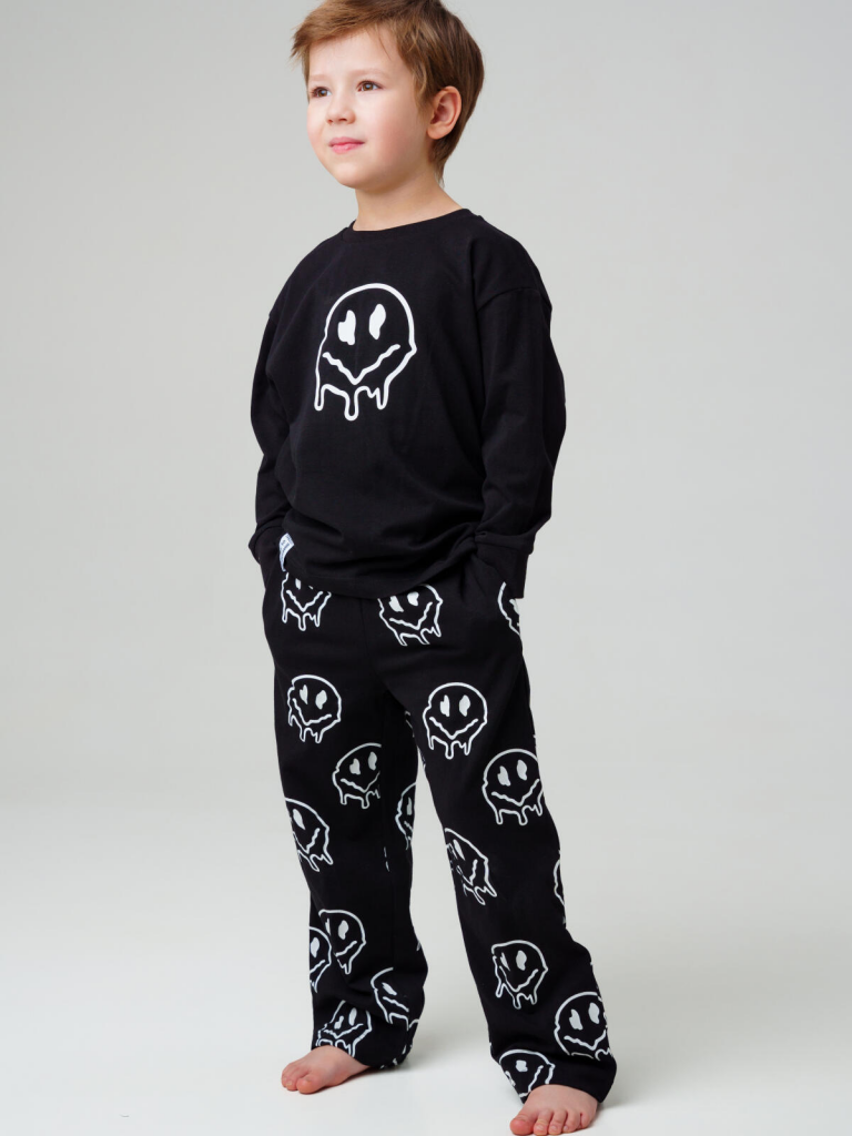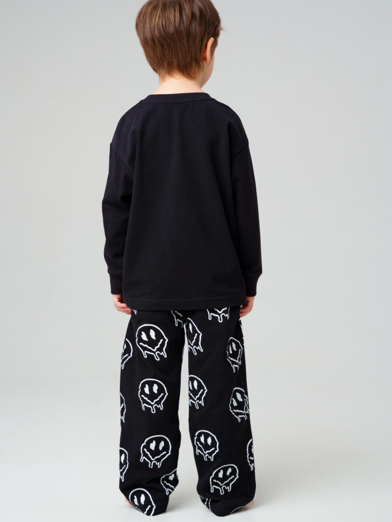 Черный детский трикотажный комплект для мальчика от PlayToday — стильный и удобный костюм, состоящий из лонгслива с длинным рукавом и брюк на резинке. Модель разработана специально для детей от 3 до 7 лет и станет отличным решением как для дома, так и для похода в детский сад.Особенности модели:+ мягкий и эластичный трикотаж — приятен к телу, не раздражает кожу и позволяет коже дышать+ лонгслив с длинным рукавом — универсальная замена футболке в прохладное время года+ брюки на комфортной резинке — легко надевать и удобно носить, хорошо держатся на талии+ светящийся в темноте принт на футболке и брюках — эффектный дизайн, который понравится детям и сделает образ ярким и необычным+ отсутствие карманов — ничего не мешает во время сна, игр и занятий в детском саду+ свободный крой — не сковывает движений, подходит для активных игр и прогулокСовет по стилю:Комплект можно носить как самостоятельный образ или сочетать с худи, жилеткой или ветровкой PlayToday. Брюки легко комбинируются и с другими футболками или лонгсливами, создавая разные варианты для повседневного гардероба.Размеры: модель представлена на рост 98, 104, 110, 116 и 122 см — подходит для мальчиков от 3 до 7 лет.Модный детский трикотажный костюм для мальчика с лонгсливом и брюками на резинке от PlayToday — идеальный выбор для детского сада, дома и активных прогулок.