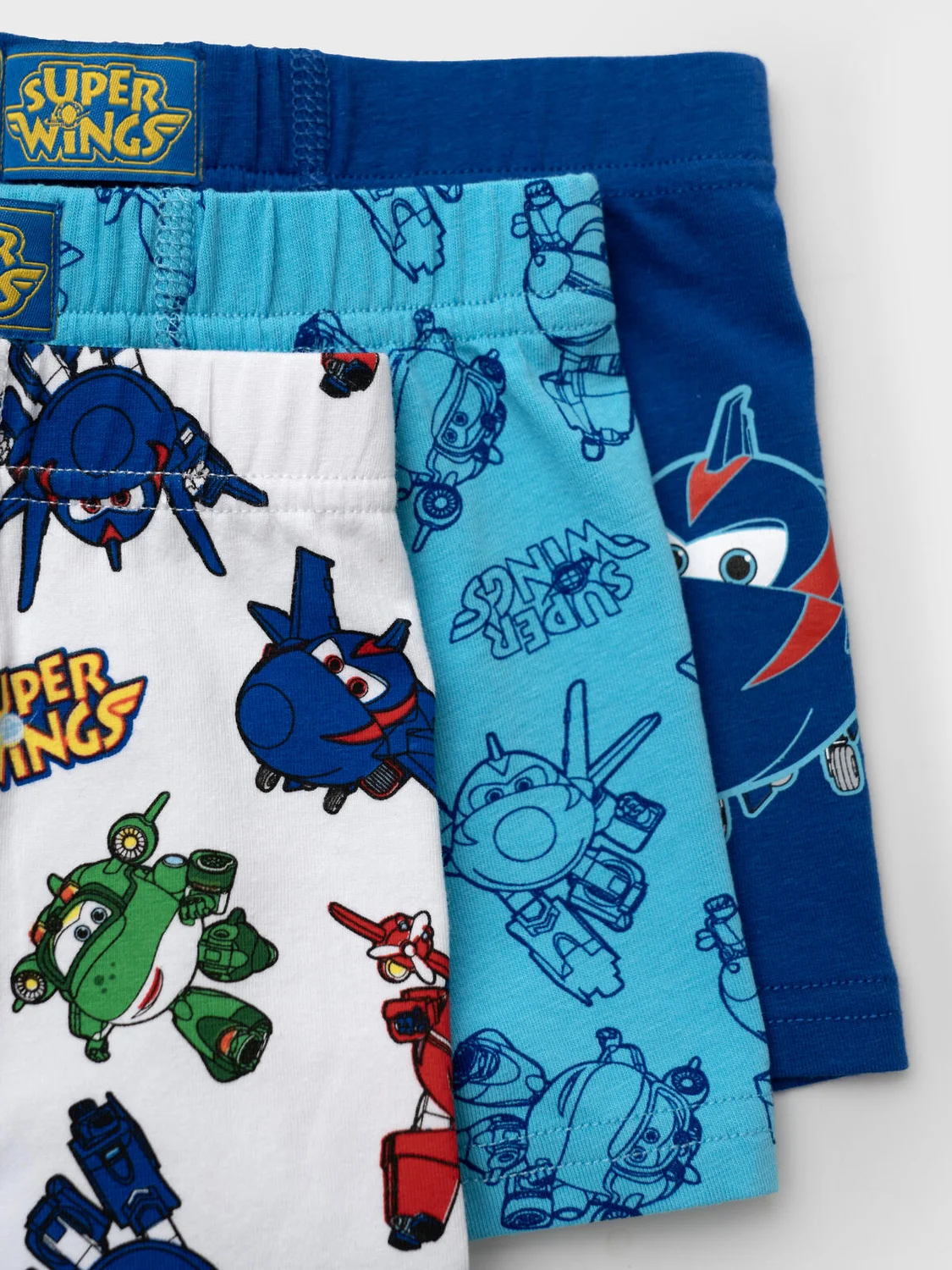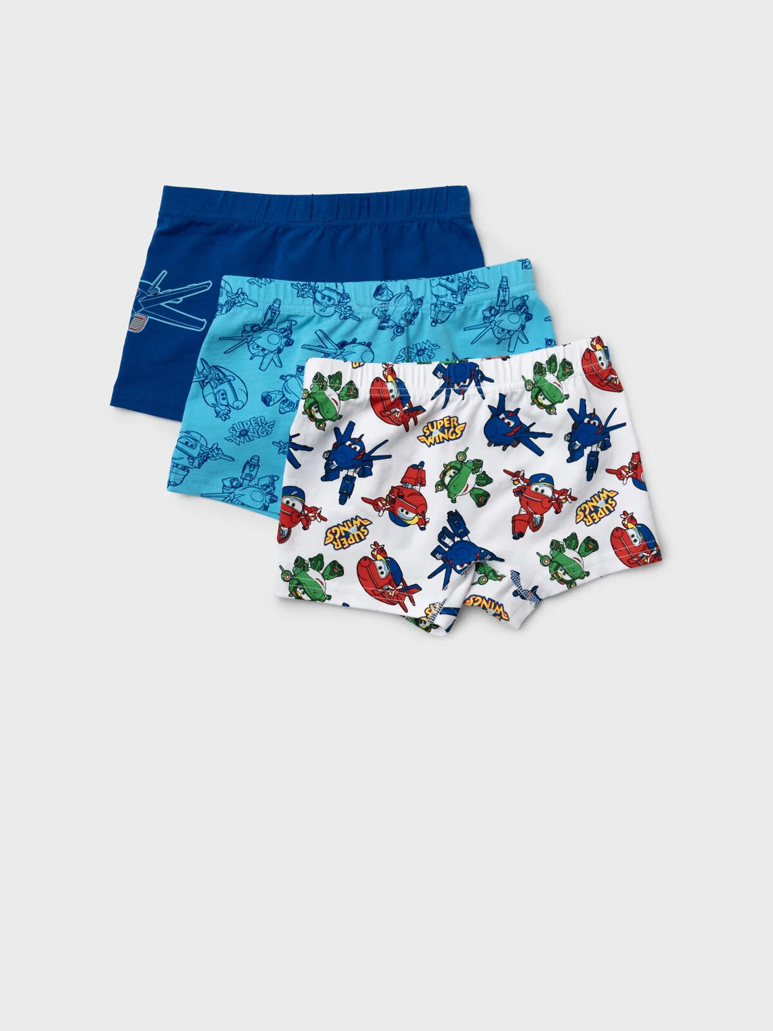 Набор из трех детских трусов-боксеров для мальчика. Изделие плотно прилегает к телу, не имеет боковых швов, что делает его особенно комфортным. Эластичный пояс с логотипом бренда обеспечивает надёжную посадку. Принт с любимыми героями - Super Wings. Материал — мягкий хлопковый трикотаж, приятный к телу.