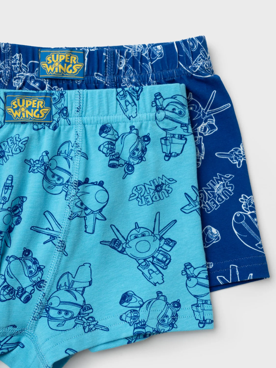 Набор из двух детских трусов-боксеров для мальчика. Изделие плотно прилегает к телу, не имеет боковых швов, что делает его особенно комфортным. Эластичный пояс с логотипом бренда обеспечивает надёжную посадку. Принт с любимыми мультяшными героями Super Wings. Материал — мягкий хлопковый трикотаж, приятный к телу.