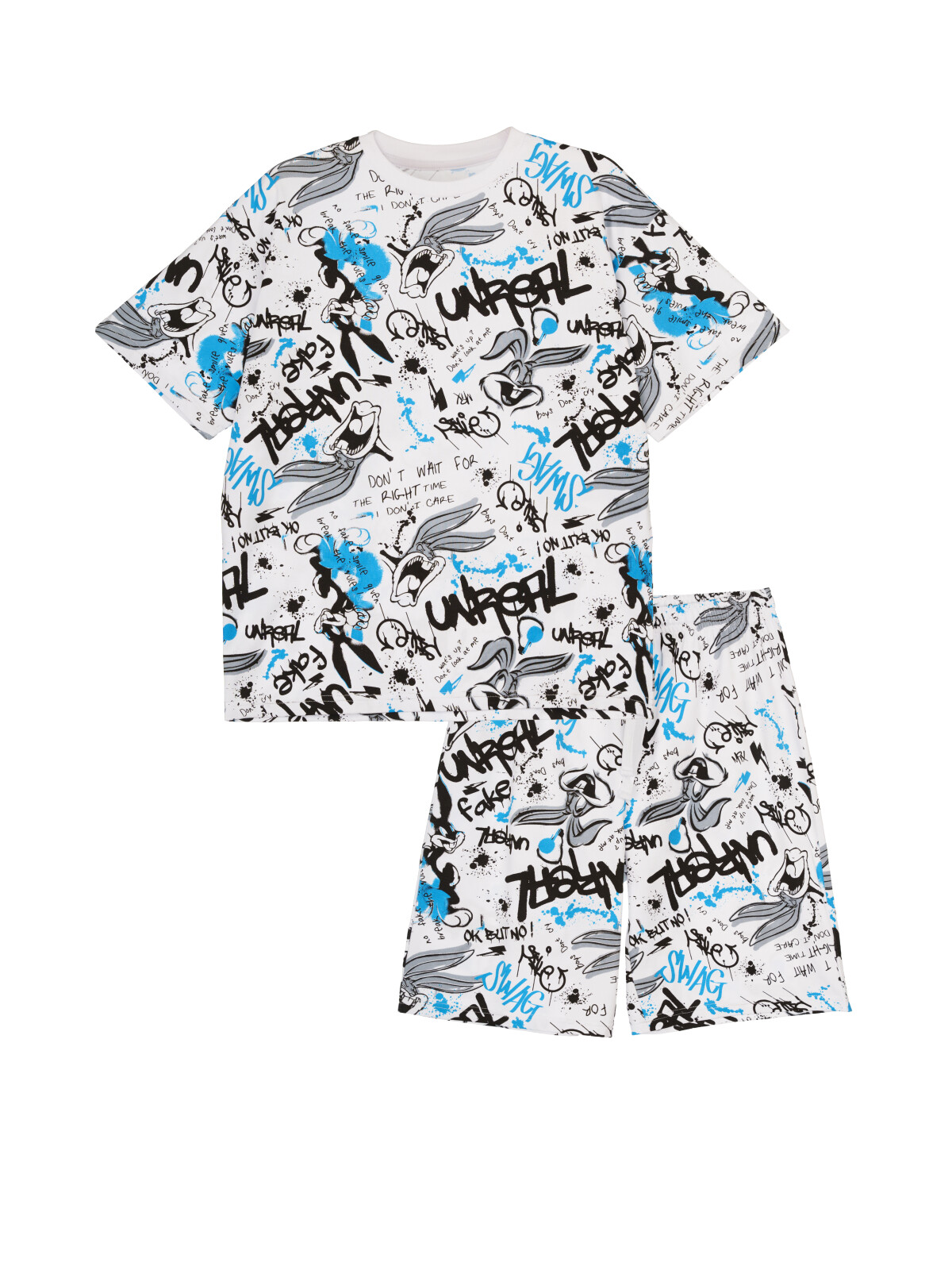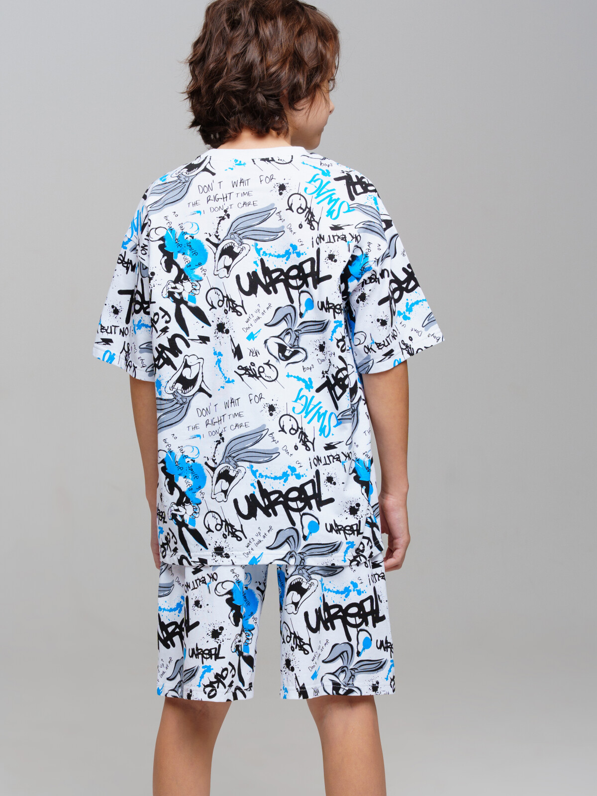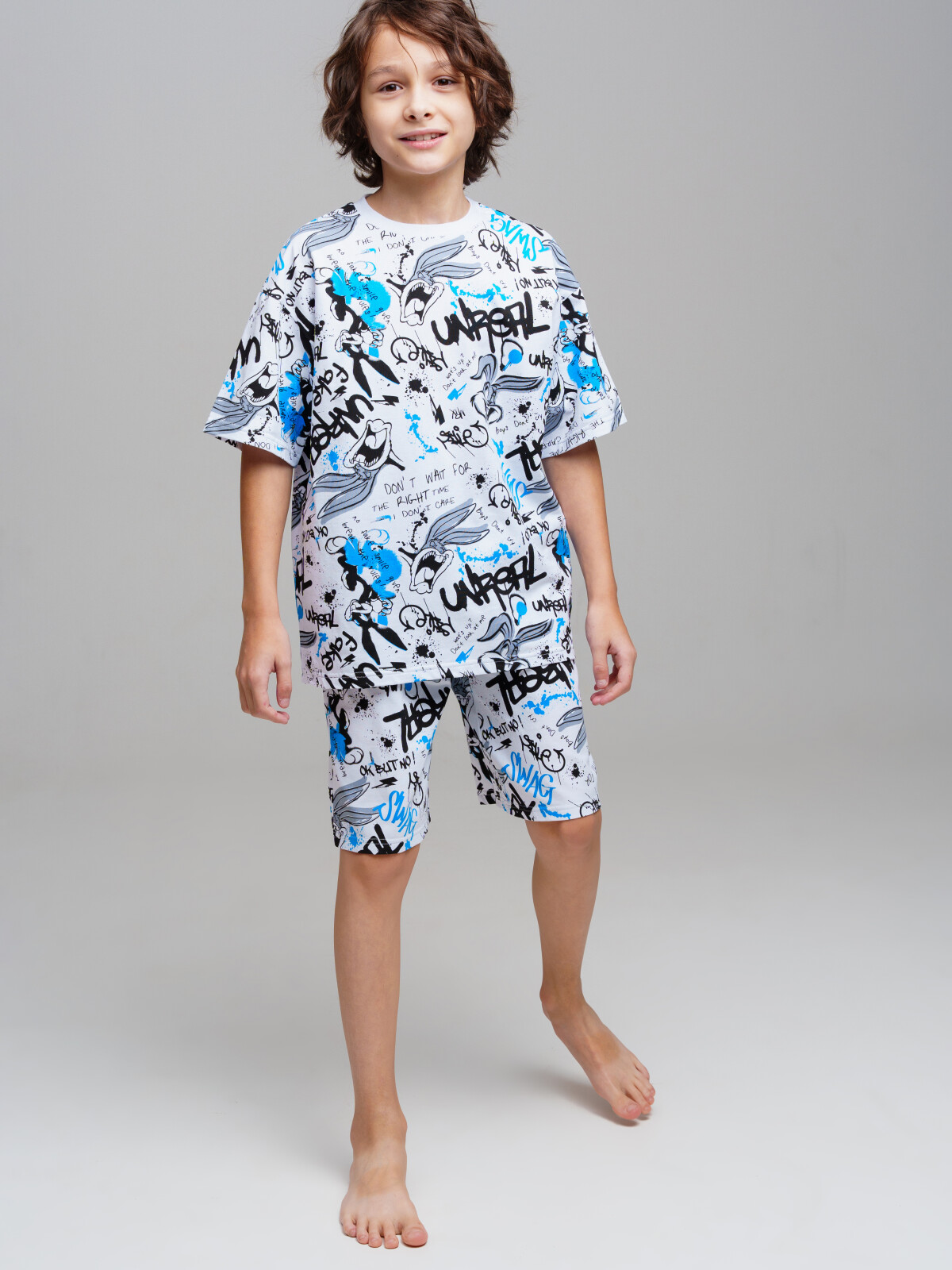 Пижама для мальчика подростка. Футболка и шорты из эластичного и приятного на ощупь трикотажа. Шорты на резинке со шнурком. Высокое содержание хлопка 95%. Благодаря наличию эластана в составе ткани изделие держит форму и меньше мнется.
