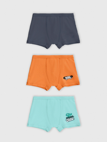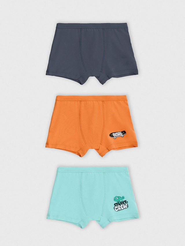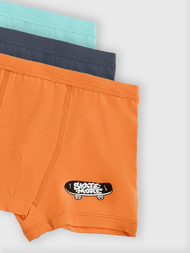 Набор из трёх пар трусов-боксеров для мальчиков ярких расцветок — бирюзовый, оранжевый и серый. Надписи: «Skate more» («Катайся больше») и «Street crew» («Уличная команда») — весёлые и динамичные фразы, которые добавляют белью характер и настроение.