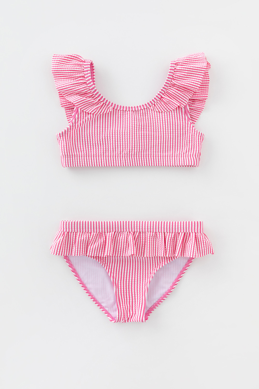 Раздельный купальник для девочки. Топ с воздушными оборками на эластичных бретелях и плавки на резинке с оборками. Оригинальная набивка выполнена из стойких гипоаллергенных красителей.