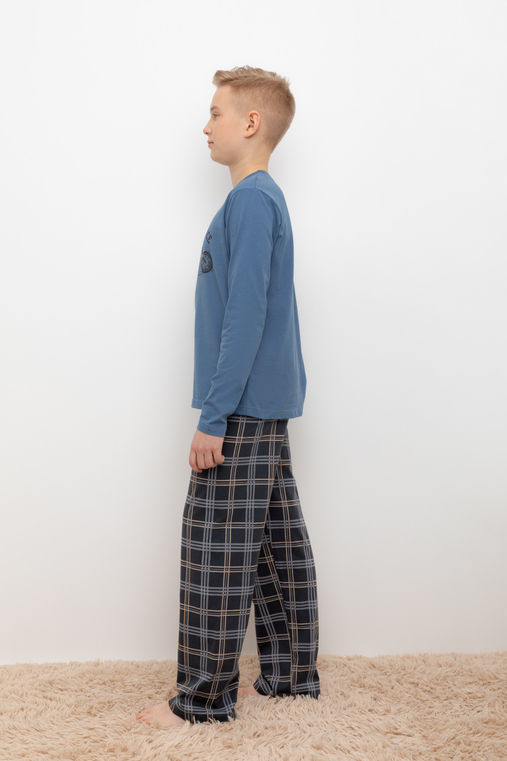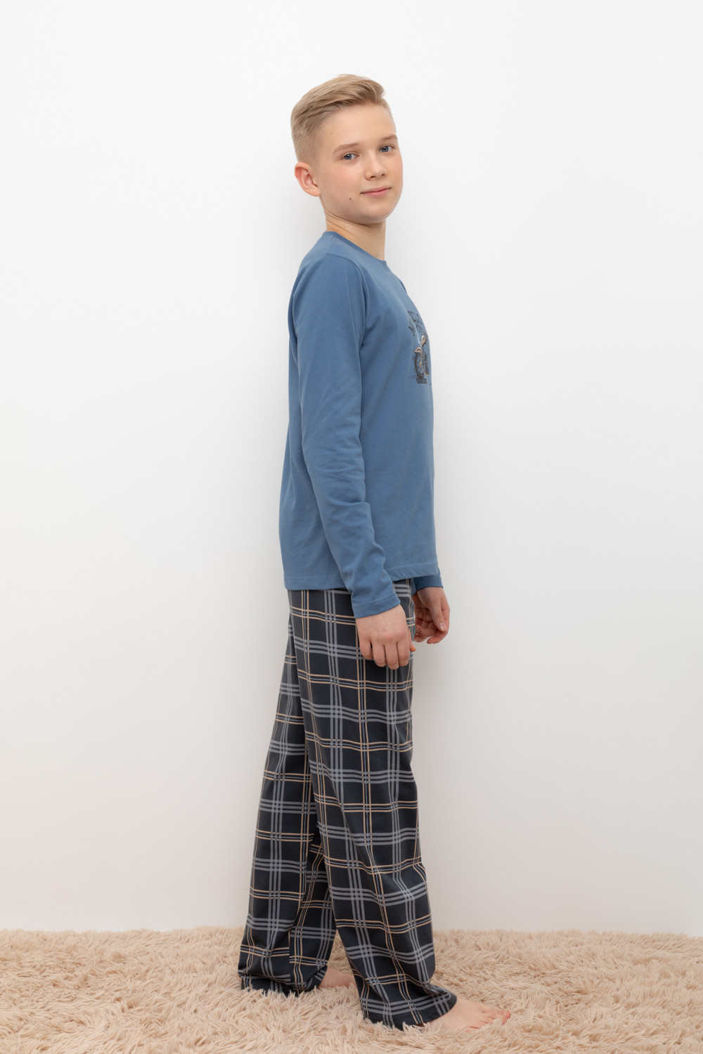 Трикотажный пижамный комплект из натурального хлопка. У джемпера длинные втачные рукава. Брюки с удобным поясом на резинке и утягивающим плетеным шнуром. Оригинальная набивка выполнена из стойких, гипоаллергенных текстильных красителей. Все трикотажные полотна производятся в соответствии с нормами Швейцарского сертификата ЭкоТекс.