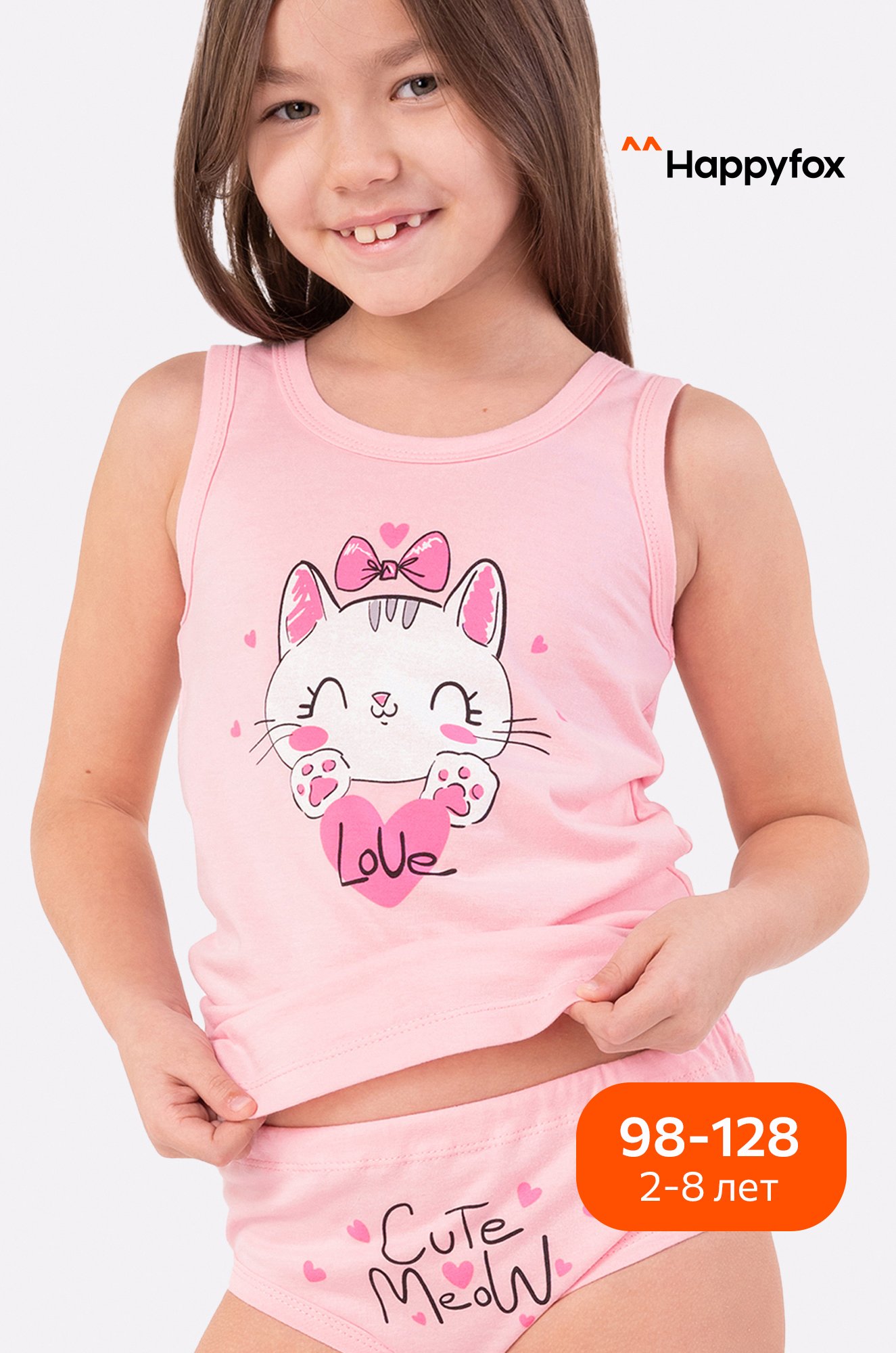 Детский набор из майки и трусов-слипов..показать для девочек выполнен из натурального 100% хлопка. Розовый комплект станет любимым благодаря комфортной посадке и забавному принту Котик.
