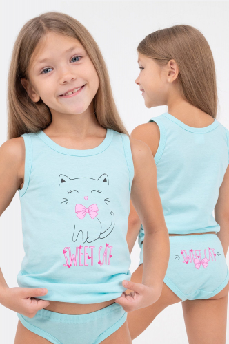Бельевой набор для детей выполнен из легкой трикотажа. Маечка и трусики из трикотажа не стесняют движений. Эластичная резинка слипов нежно прилегает к телу. Широкие бретели майки не спадают во время движений.