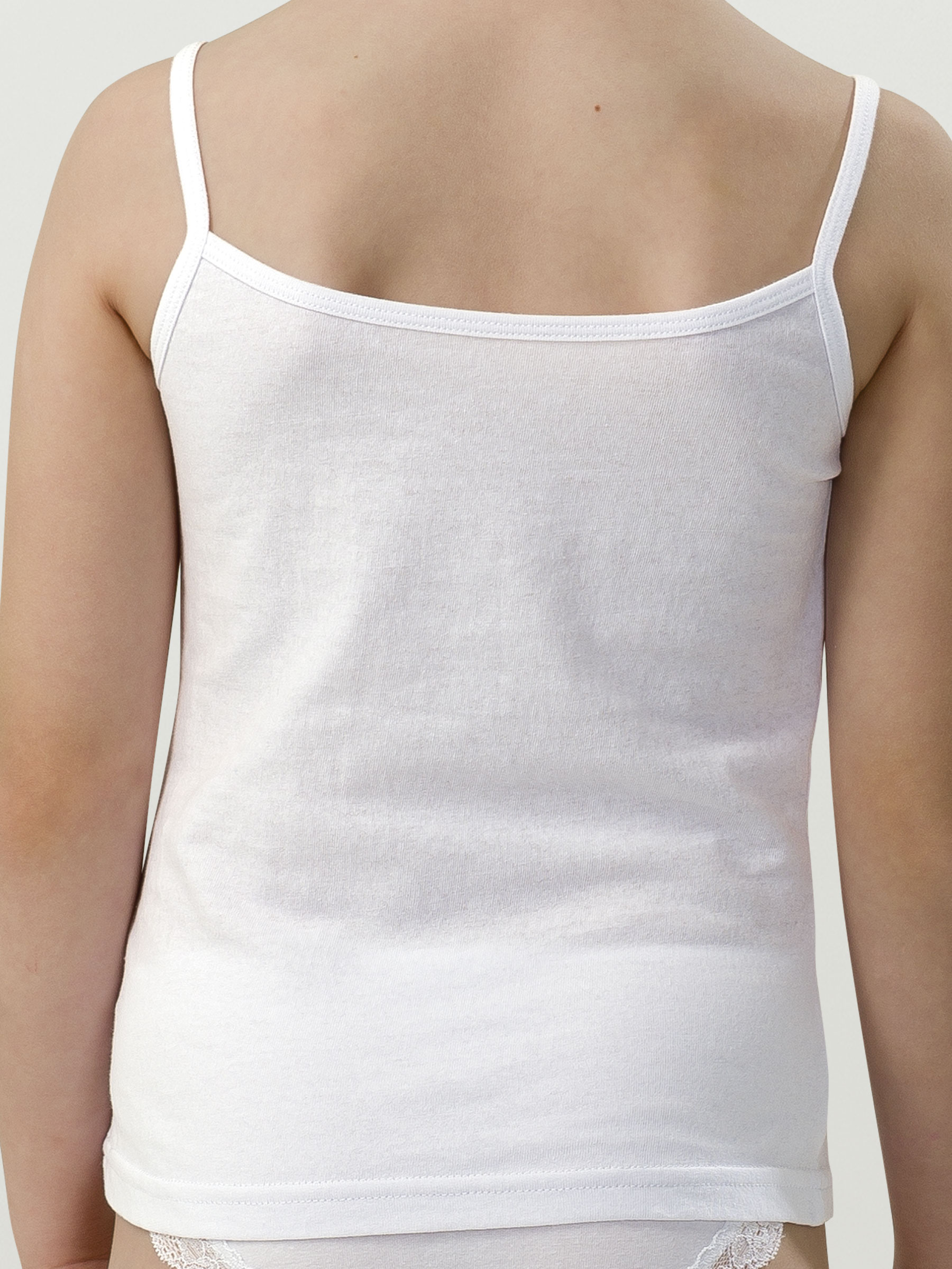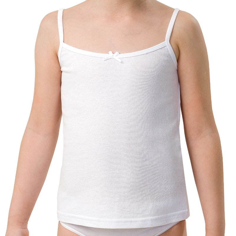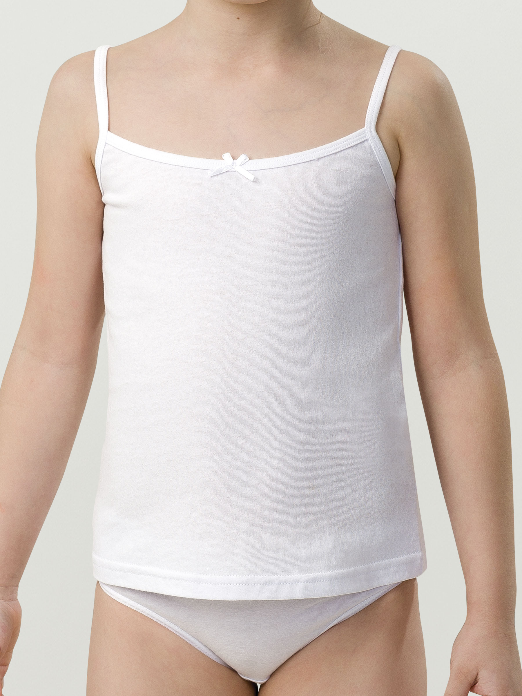 Белый(2) Майка для девочки на тонких лямках из 100% хлопка. Качественный материал и пошив, аккуратные швы, которые не доставят дискомфорт ребенку. Удобная и практичная модель подходит для повседневной носки дома как одежда для сна, для занятия спортом и в школу для подростка.