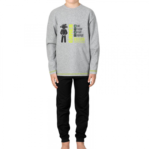 Состав: верх: 100%хлопок, низ: 100%хлопокОписание: Уютная пижама для мальчика. Изделие выполнено из 100% хлопка — идеальный вариант для детской пижамы. Ткань из хлопка приятна на ощупь и превосходно пропускает воздух, позволяя коже ребёнка дышать. В пижаме из хлопка ребёнку будет комфортно, даже если он сбросит одеяло. Джемпер и брюки умеренного объёма, рукава свободные — пижама очень удобна для сна. В поясе брюк мягкая и широкая резинка — не перекручивается и не давит. Манжеты брюк и отделка горловины джемпера из эластичной рибаны — комплект удобно надевать и снимать. А также резинка отлично сохраняет форму в течение долгого времени. Брюки выполнены в практичном чёрном цвете и лаконичном дизайне. Джемпер актуального оттенка "серый меланж" украшен контрастными строчками по низу и рукавам — один из модных трендов. По переду забавный принт геймерской тематики — порадует любого мальчишку! Перевод: "Есть, спать, играть, повторять. Счастье". Принт мягкий и эластичный, отлично переносит многочисленные стирки. Комплект подходит для сна как дома, так и в детском саду