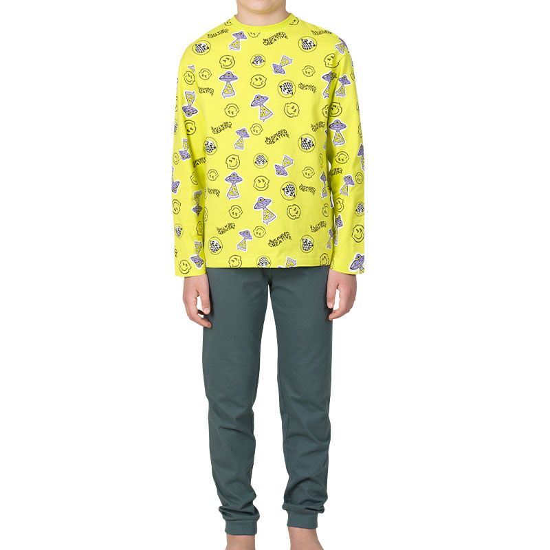 Состав: верх: 100%хлопок, низ: 100%хлопокОписание: Яркая и уютная пижама для мальчика. В составе ткани 100% хлопка — идеально для детской одежды! Изделие приятно на ощупь, отлично пропускает воздух, давая коже ребёнка дышать. Благодаря этому сон беззаботный и здоровый. В пижаме из хлопка ребёнку будет комфортно, даже если он сбросит одеяло во сне. Джемпер и брюки умеренного объёма, рукава свободные — комплект очень удобен для сна и игр. В поясе брюк мягкая и широкая резинка — не перекручивается и не давит. Манжеты брюк и отделка горловины джемпера из эластичной рибаны — ребёнку удобно надевать и снимать пижаму. А также резинка сохраняет отличную форму надолго даже после частых стирок. Брюки выполнены в практичном тёмно-зелёном цвете и лаконичном дизайне. Джемпер трендового желтого цвета декорирован забавным принтом, его оценит любой мальчик. Перевод: "Ошибка вдохновения". Комплект подходит для игр и сна как дома, так и в детском саду — отличный выбор для вашего ребёнка! Станет замечательным подарком, который способен вызвать искреннюю радость у вашего сына, в