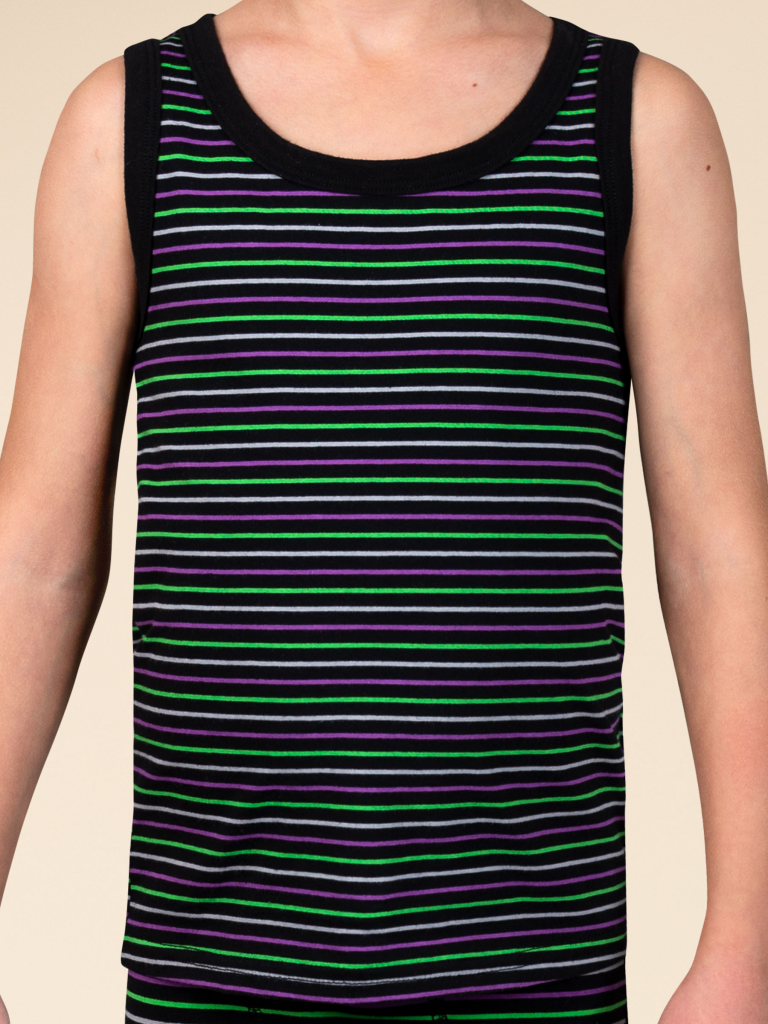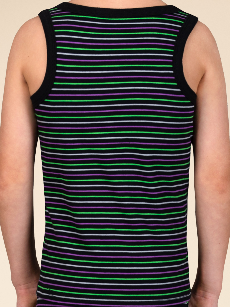 Если вы в поисках качественного, комфортного и стильного белья для своего ребёнка, обратите внимание на нашу майку из 100% хлопка для мальчика. Натуральный состав ткани обеспечивает изделию мягкость и воздухопроницаемость — кожа ребёнка дышит. Майка детская комфортно сидит по фигуре, её можно надевать под рубашку, джемпер, свитер. Горловина и проймы изделия отделаны пайпингом в тон — они хорошо держат форму, надолго сохраняют аккуратный внешний вид. Чёрная хлопковая майка в фиолетово-зелёную полоску лаконичного дизайна, неприхотлива в уходе. В линейке представлены майки детские следующих размеров: 1 (86): 2 (92): 3 (98): 4 (104): 5 (110): 6 (116): 7 (122): 8 (128): 9 (134): 10 (140): 11 (146). Нательная майка для мальчика подходит для повседневной носки, отдыха, а также для сна и дома — прекрасный выбор для вашего ребёнка! Изделие можно носить круглый год: летом, весной и осенью (демисезон), зимой. Майка детская для мальчиков — замечательный подарок сыну, внуку, брату на любой праздник. Выбирайте нужный размер по таблице размеров на фото. Цвет товара на экране вашего устройства может отличаться от цвета изделия вживую. Товар возврату и обмену не подлежит. Состав: 100%хлопок Возрастная группа: Kids Сезон: Весна Год: 2024 Пол: Мальчики