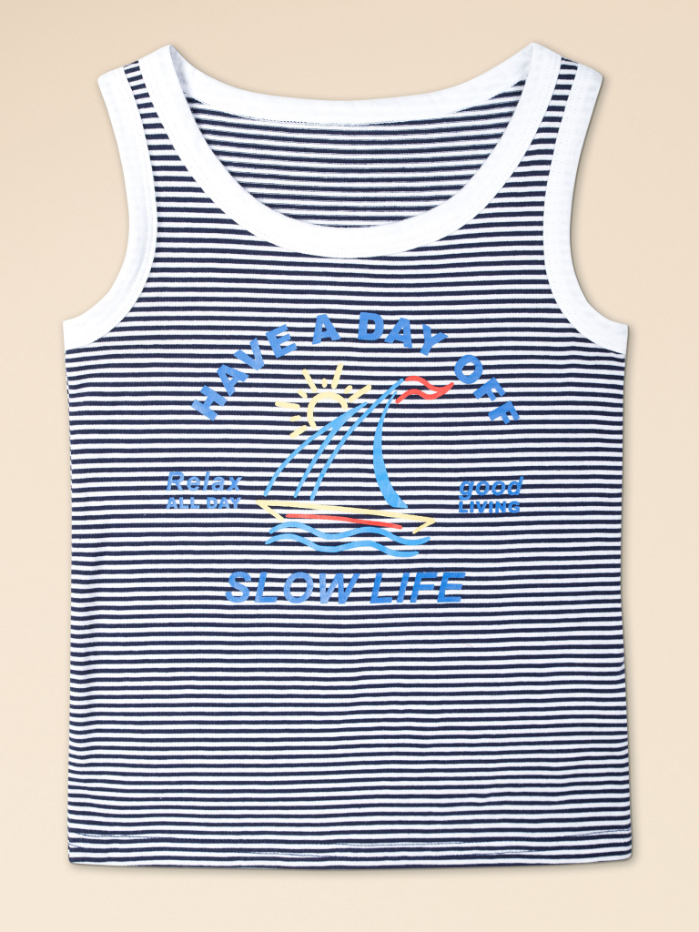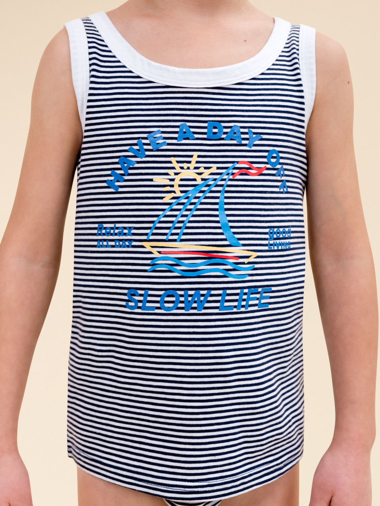 Если вы в поисках качественного, комфортного и стильного белья для своего ребёнка, обратите внимание на нашу майку из 100% хлопка для мальчика. Натуральный состав ткани обеспечивает изделию мягкость и воздухопроницаемость — кожа ребёнка дышит. Майка детская комфортно сидит по фигуре, её можно надевать под рубашку, джемпер, свитер. Горловина и проймы изделия отделаны белым пайпингом — они хорошо держат форму, надолго сохраняют аккуратный внешний вид. Хлопковая майка в полоску украшает позитивный принт в виде парусника и солнышка. Надписи переводятся: "отдых", "отдыхать целый день", "хорошая жизнь", "медленная жизнь". Принт эластичный и прочный — отлично переносит частые стирки. В линейке представлены майки детские следующих размеров: 1 (86): 2 (92): 3 (98): 4 (104): 5 (110): 6 (116): 7 (122): 8 (128): 9 (134): 10 (140): 11 (146). Нательная майка для мальчика подходит для повседневной носки, отдыха, а также для сна и дома — прекрасный выбор для вашего ребёнка! Изделие можно носить круглый год: летом, весной и осенью (демисезон), зимой. Майка детская для мальчиков — замечательный подарок сыну, внуку, брату на любой праздник. Выбирайте нужный размер по таблице размеров на фото. Цвет товара на экране вашего устройства может отличаться от цвета изделия вживую. Товар возврату и обмену не подлежит. Состав: 100%хлопок Возрастная группа: Kids Сезон: Весна Год: 2024 Пол: Мальчики