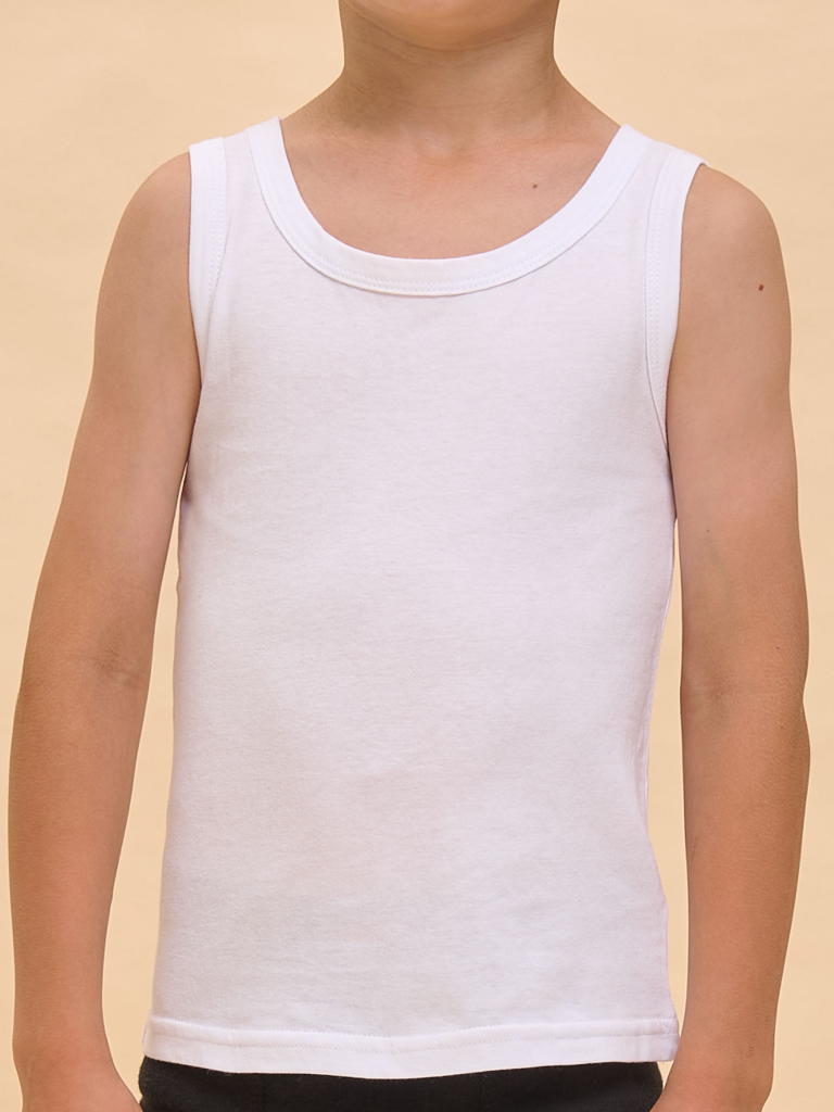 Бельевая майка для мальчика из 100% натурального хлопка. Пошив высокого качества, аккуратные швы, которые не доставят дискомфорт ребенку. Майка на широких бретельках идеально впишется в гардероб мальчиков как детское нижнее белье. Удобная и практичная модель майки для детей подходит для повседневной носки дома как одежда для сна, в детский сад, для занятия спортом. Состав: 100%хлопок Возрастная группа: Junior Сезон: Весна Год: 2017 Пол: Мальчики