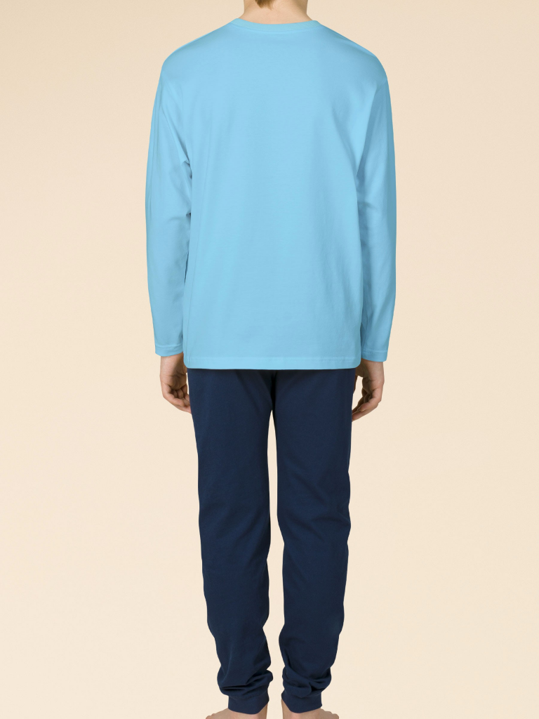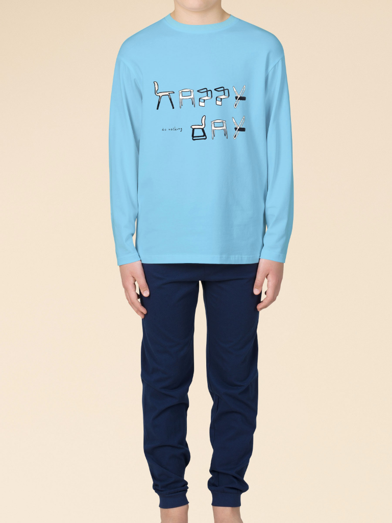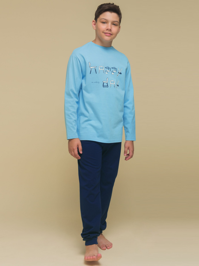 Плюс 100 к уюту с нашей стильной пижамой для мальчика! Модель в стиле "хюгге" выполнена из 100% хлопка — оптимальный состав для детской пижамы. Изделие мягкое, отлично пропускает воздух, позволяя коже ребёнка дышать. При этом в пижаме из хлопка ребёнку будет комфортно, даже если он сбросит одеяло во сне. Джемпер и брюки среднего объёма, рукава свободные — в пижаме очень удобно спать. Широкая и мягкая резинка в поясе не перекручивается и не давит. Манжеты брюк и отделка горловины джемпера из эластичной рибаны — они не растягиваются, пижаму удобно надевать и снимать. Брюки выполнены в трендовом синем цвете и лаконичном дизайне. Джемпер голубого цвета декорирован уютным принтом с позитивным текстом. Перевод: "Счастлив. День безделья". Принт мягкий и эластичный, прекрасно переносит частые стирки. Такая пижама идеальна для игр, сна как дома, так и в детском саду — прекрасный подарок любому мальчику. Станет замечательным подарком, который способен вызвать искреннюю радость у вашего сына, внука, племянника, оставив Состав: верх: 100%хлопок, низ: 100%хлопок Возрастная группа: Сезон: Осень Год: 2023 Пол: Мальчики