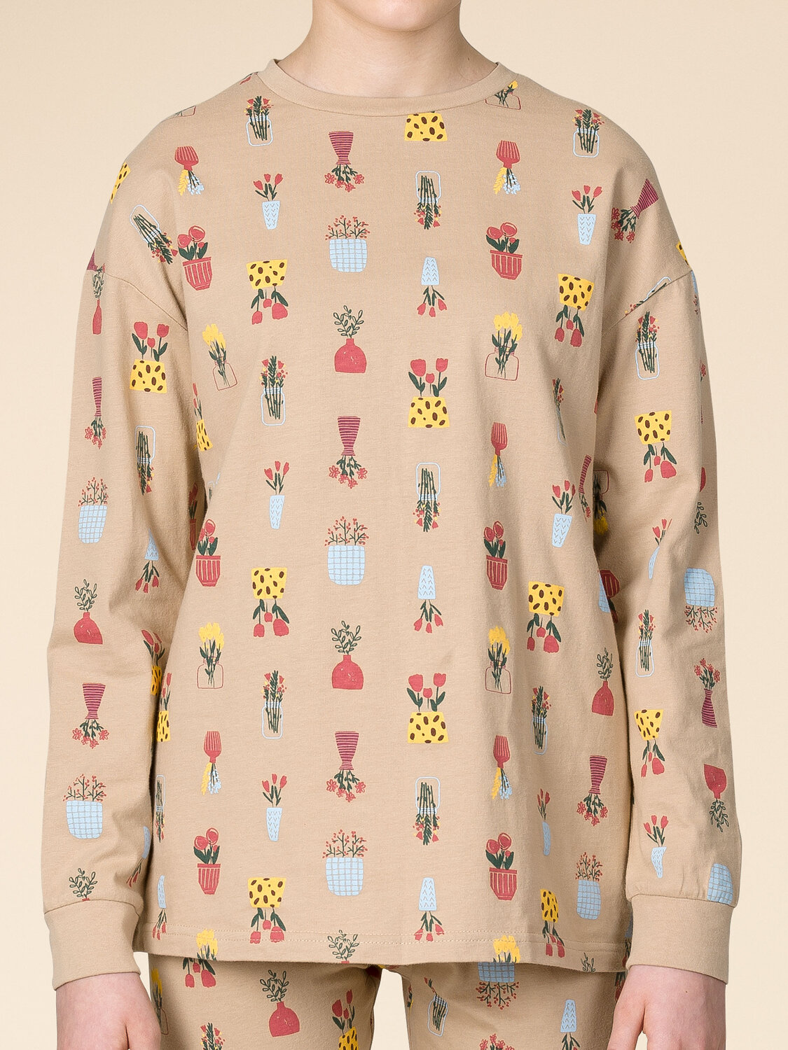 Плюс 100 к уюту с нашей милой пижамой для девочки! Модель в стиле "хюгге" выполнена из 100% хлопка — оптимальный состав для детской пижамы. Ткань изделия тёплая, приятная на ощупь, превосходно пропускает воздух — кожа ребёнка дышит. Благодаря этому сон комфортный и качественный. Джемпер и брюки среднего объёма, плечо слегка спущено, рукава широкие и свободные — пижама очень удобна для сна. Широкая и мягкая резинка в поясе не перекручивается и не давит. Манжеты и отделка горловины эластичные — комплект удобно надевать и снимать. Пижама представлена в красивом бежевом цвете "овсяное молоко" — очень уютном и нежном. Комплект украшает оригинальный цветочный принт. Он непременно понравится любой девочке. Такая пижама идеальна для сна как дома, так и в детском саду — отличный подарок вашей дочке, сестрёнке или племяннице!