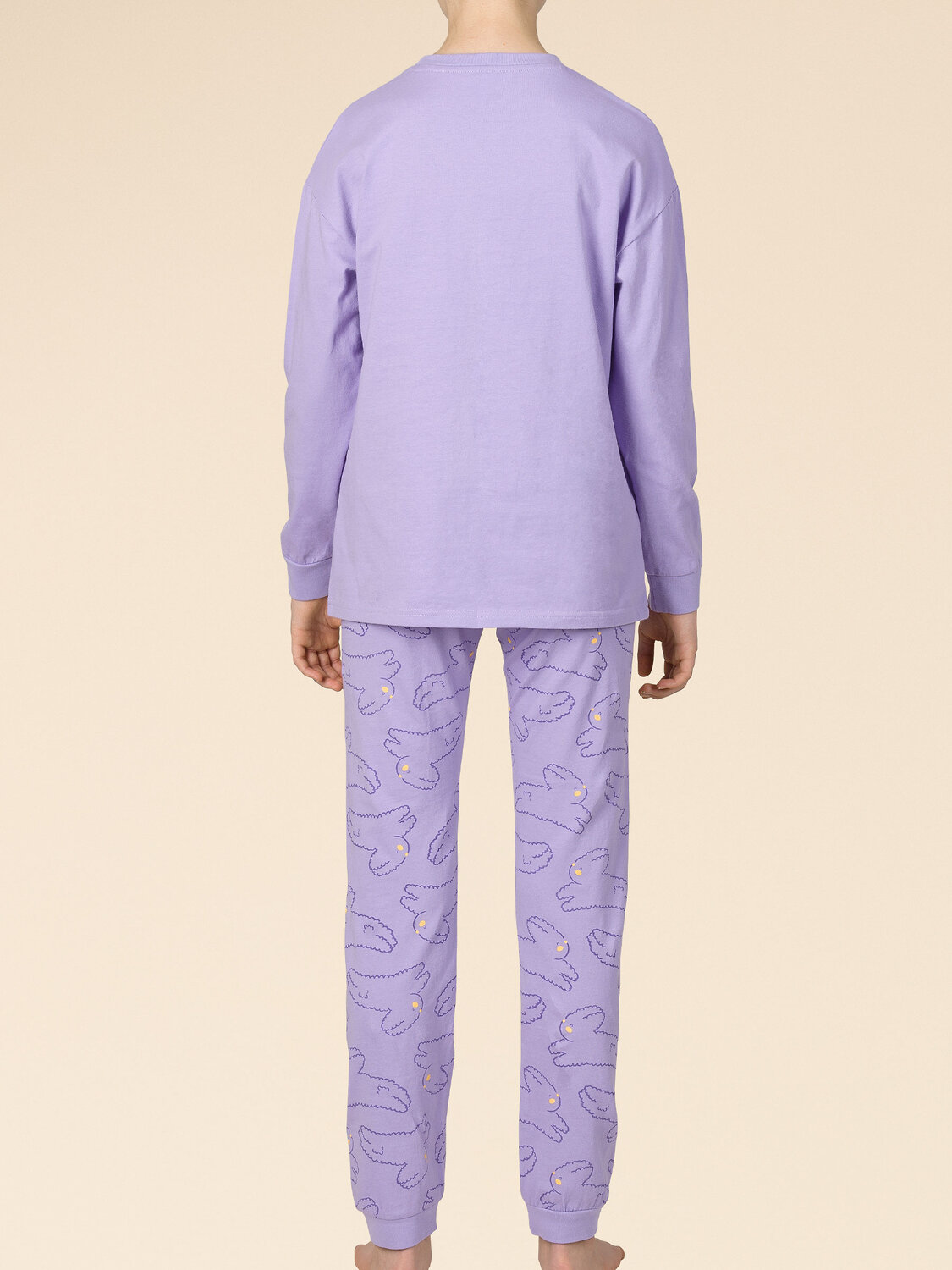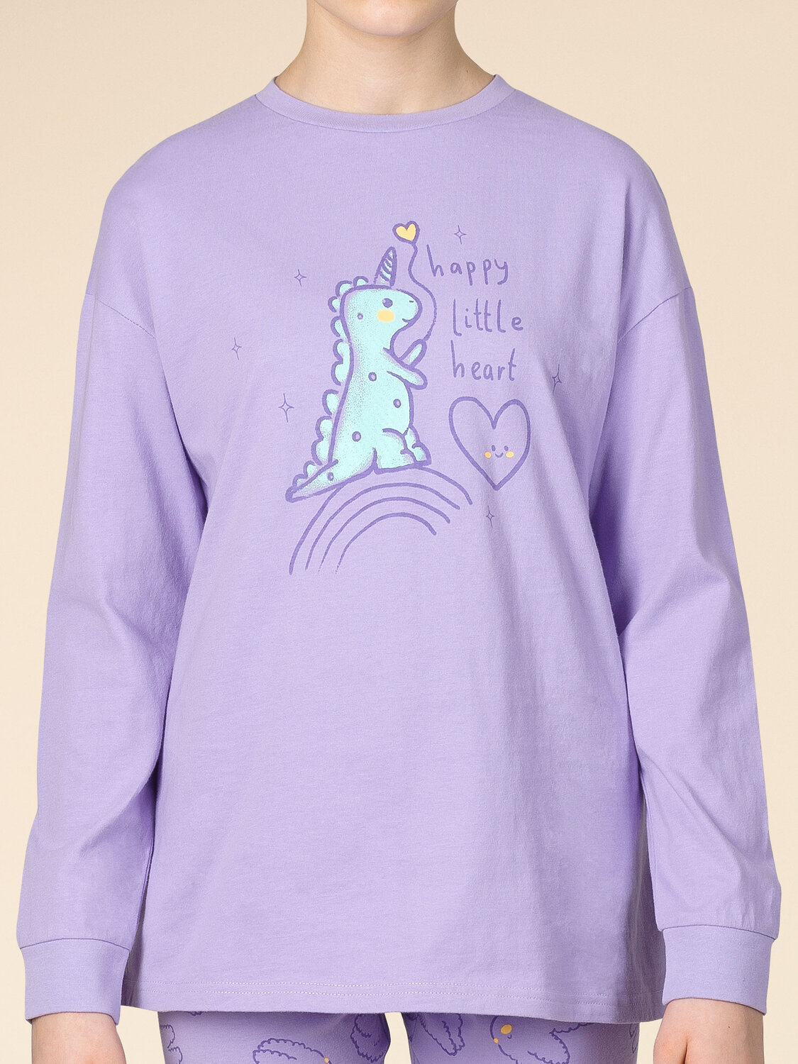 Красивая и уютная пижама супертрендового сиреневого цвета для девочки. В составе ткани 100% хлопка — идеально для детской одежды! Модель приятна на ощупь, прекрасно пропускает воздух, позволяя коже ребёнка дышать. При этом в пижаме из хлопка ребёнку будет комфортно, даже если он сбросит одеяло во сне. Всё это обеспечивает комфортный и качественный сон. Джемпер и брюки среднего объёма, плечо немного спущено, рукава широкие и свободные — в пижаме очень удобно спать, играть. Широкая и мягкая резинка в поясе не перекручивается и не давит. Манжеты и отделка горловины из эластичной рибаны — они не растягиваются, ребёнку удобно надевать и снимать пижаму. Брюки украшает принт в виде милых зверят, а джемпер декорирован принтом в виде дракончика-единорога — ни одна девочка не останется равнодушной! Перевод: "Счастливое маленькое сердечко". Комплект подходит для сна как дома, так и в детском саду — прекрасный выбор для вашего ребёнка! Станет замечательным подарком, который способен вызвать искреннюю радо